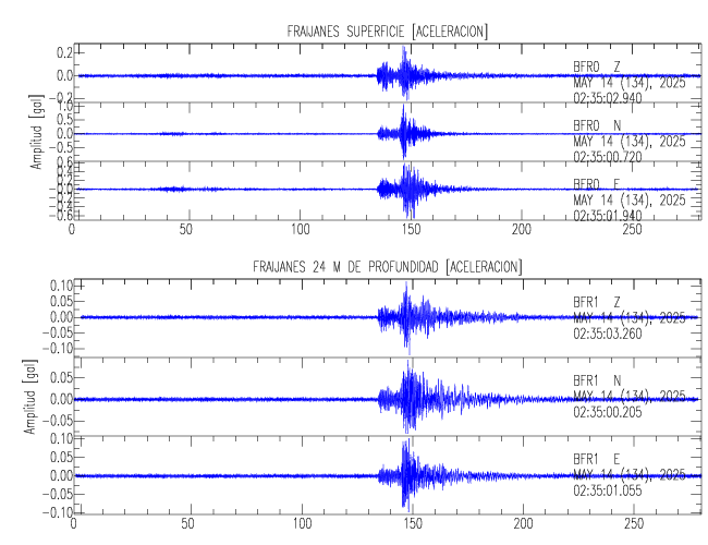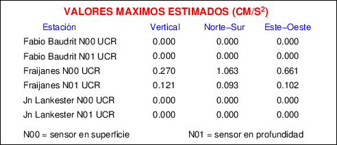 Aquí se muestran las formas de onda y cocientes espectrales de los sensores colocados en pozo . Uno se ubica en el Jardín Lankester en Paraíso de Cartago con 30 m de profundidad y el otro en la Estación Experimental Fabio Baudrit en Alajuela con 40 m de profundidad. La tabla muestra los valores de aceleración máxima (PGA) leídos de las tres componentes en superficie (N00) y en profundidad (N01)