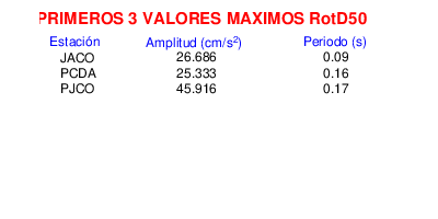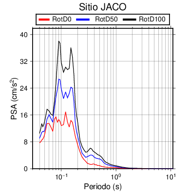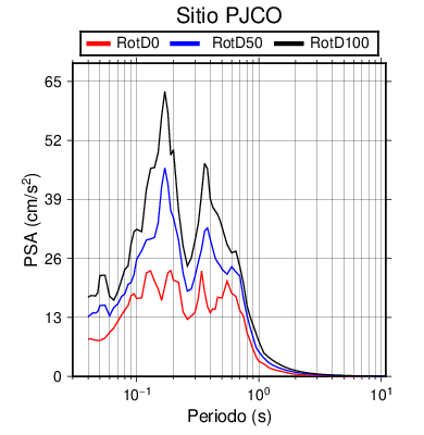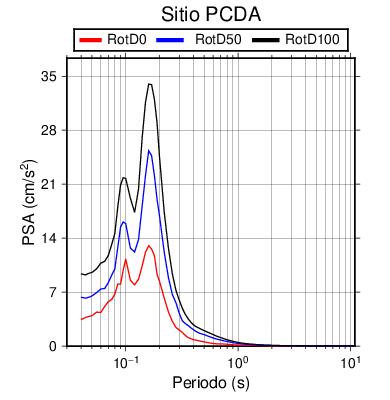 RotD50 representa un valor medio de la respuesta por lo cual se puede comparar con valores de otras medidas empleadas en modelos de atenuación como la Media Geométrica de las componentes ortogonales (GM). RotD0 y RotD100 son los valores extremos (mínimo y máximo), los cuales nos pueden servir para determinar la dispersión de la posible respuesta en cada sitio.