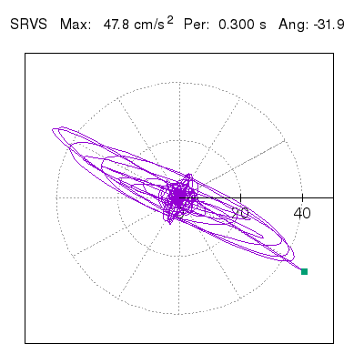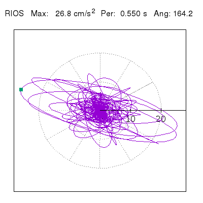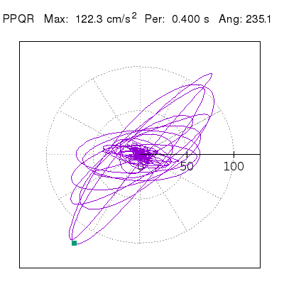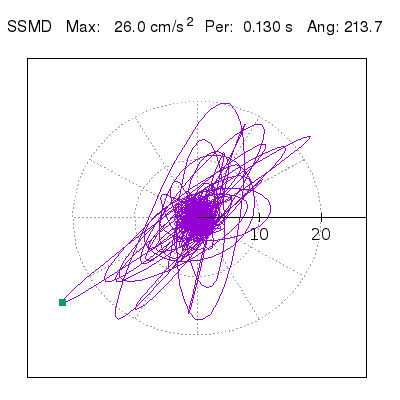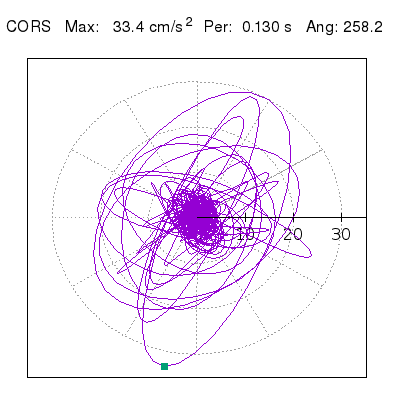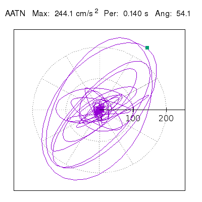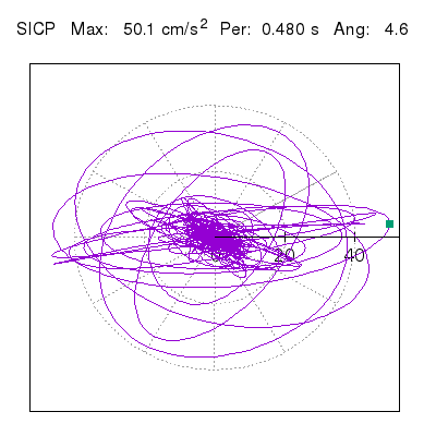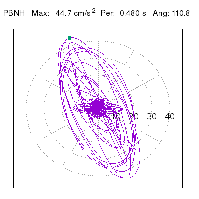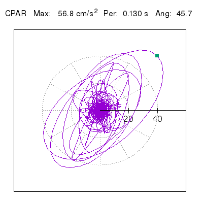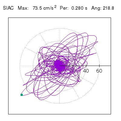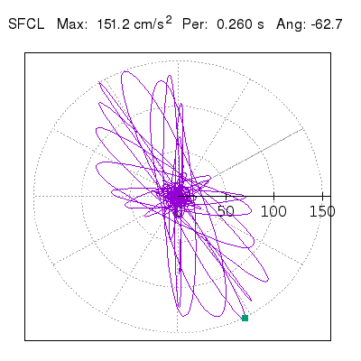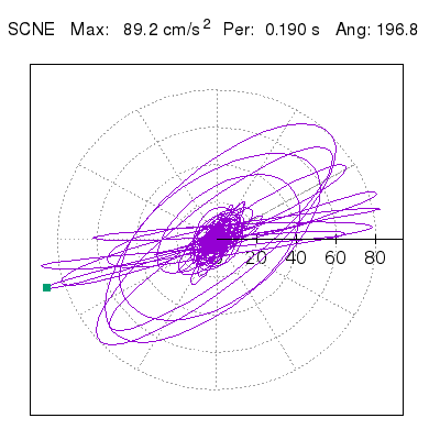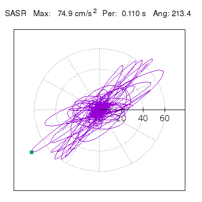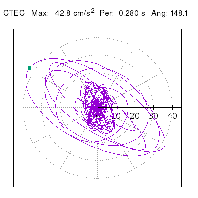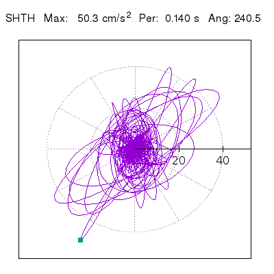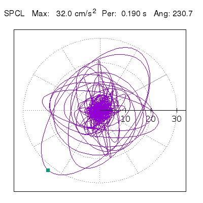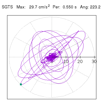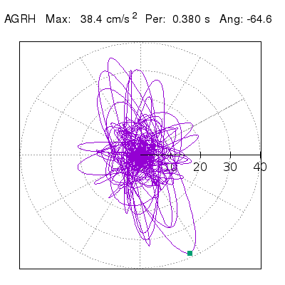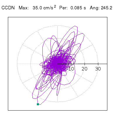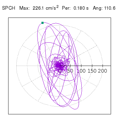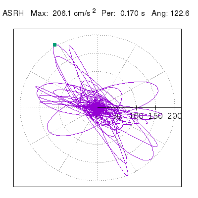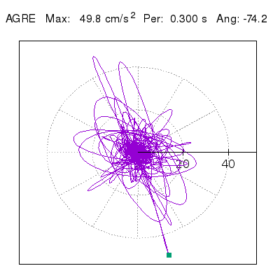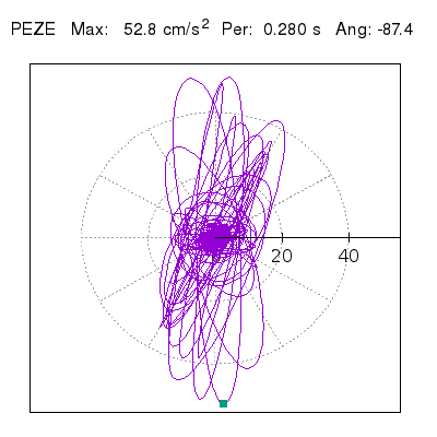 Tomando el periodo en el cual se presenta la amplitud máxima del espectro de respuesta máxima para cada estación, se representa la respuesta bidireccional en función del tiempo sobre el plano horizontal. Se identifica el punto (color verde en cada figura) del cual se desprende la orientación mostrada en el mapa de la sección superior. El valor de la acelereración máxima corresponde al punto del espectro de respuesta para el periodo indicado.