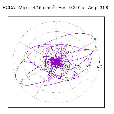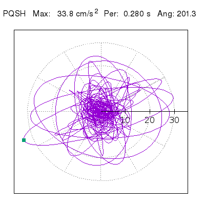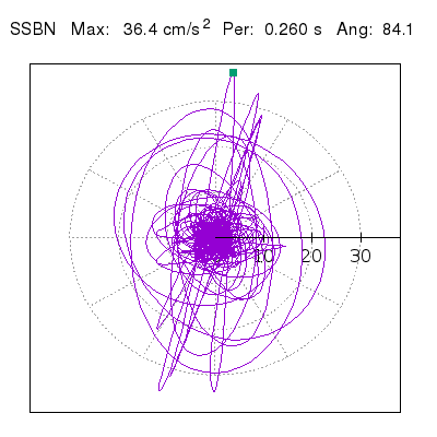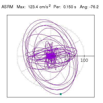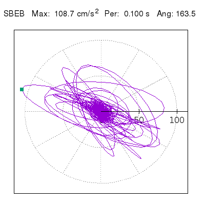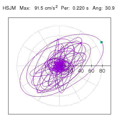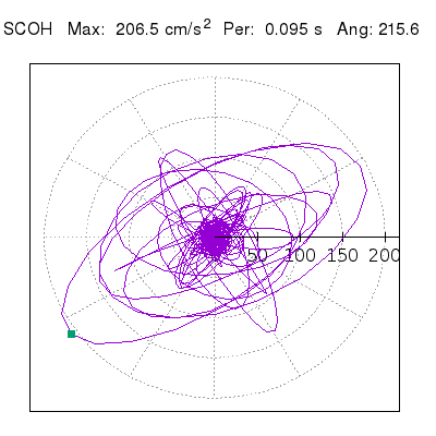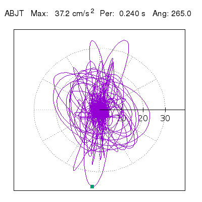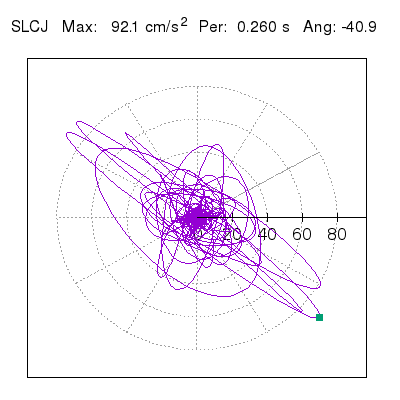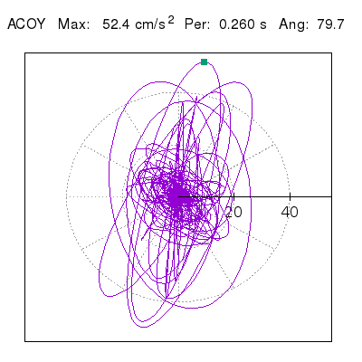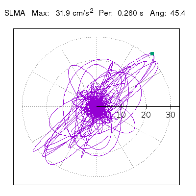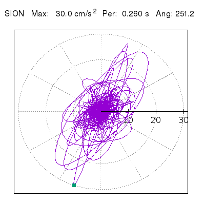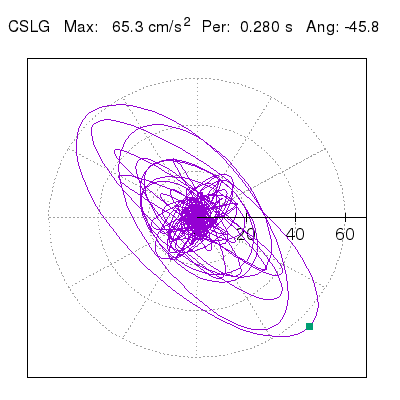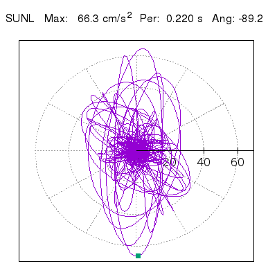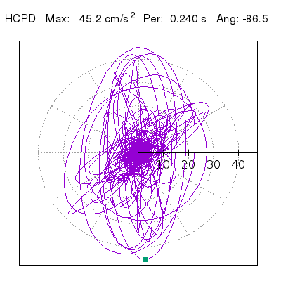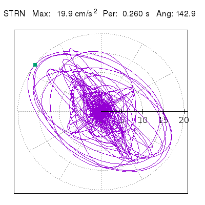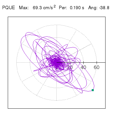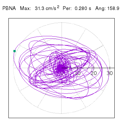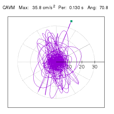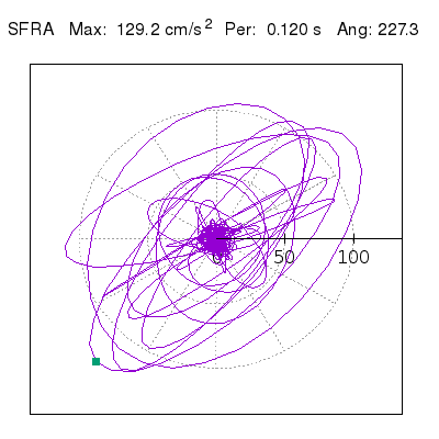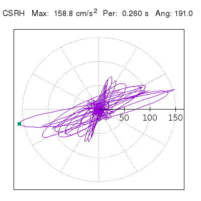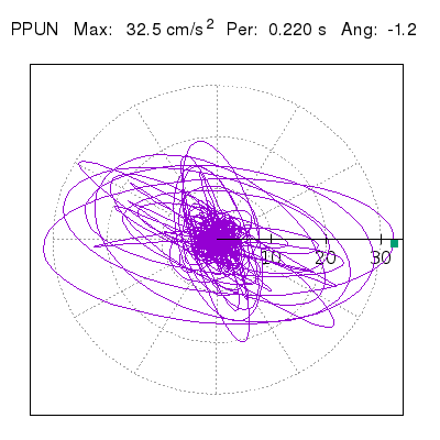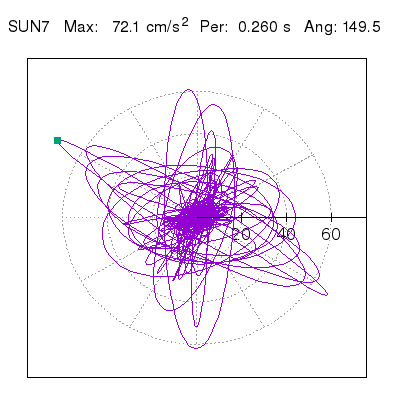 Tomando el periodo en el cual se presenta la amplitud máxima del espectro de respuesta máxima para cada estación, se representa la respuesta bidireccional en función del tiempo sobre el plano horizontal. Se identifica el punto (color verde en cada figura) del cual se desprende la orientación mostrada en el mapa de la sección superior. El valor de la acelereración máxima corresponde al punto del espectro de respuesta para el periodo indicado.