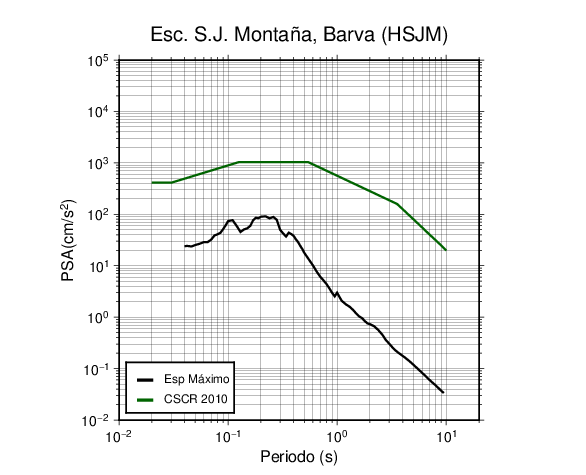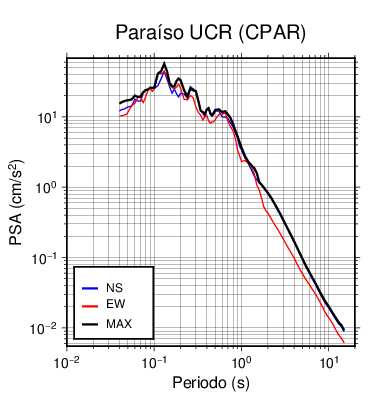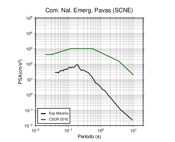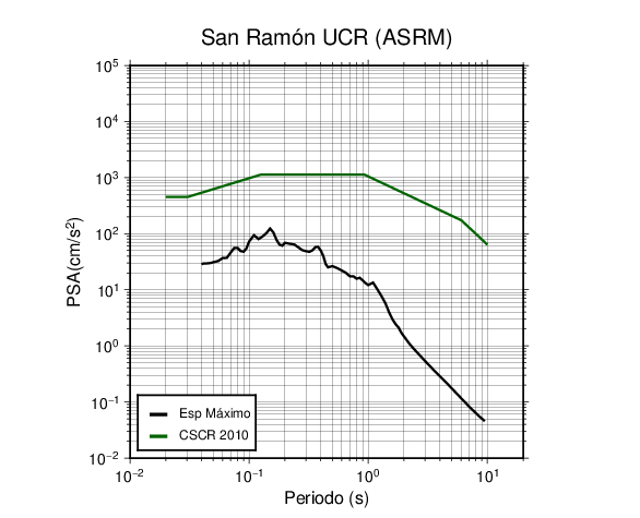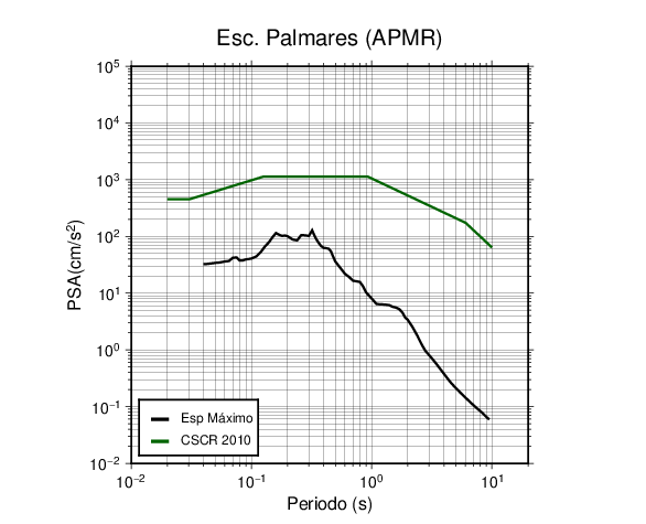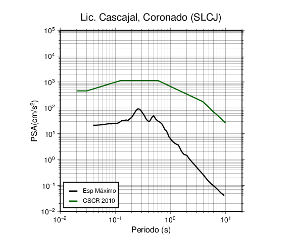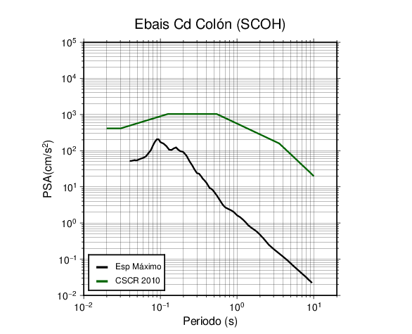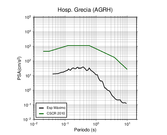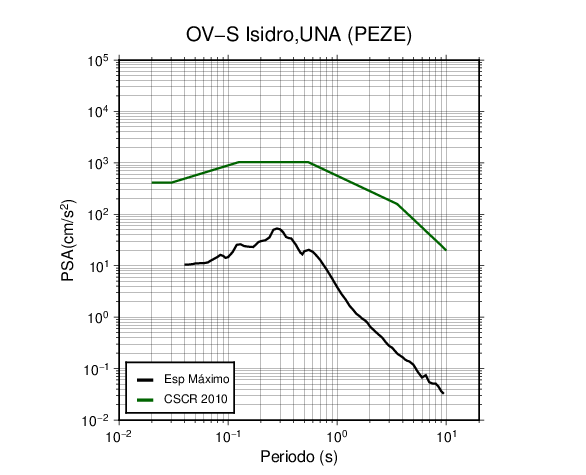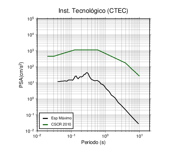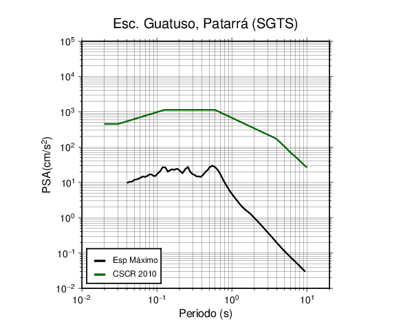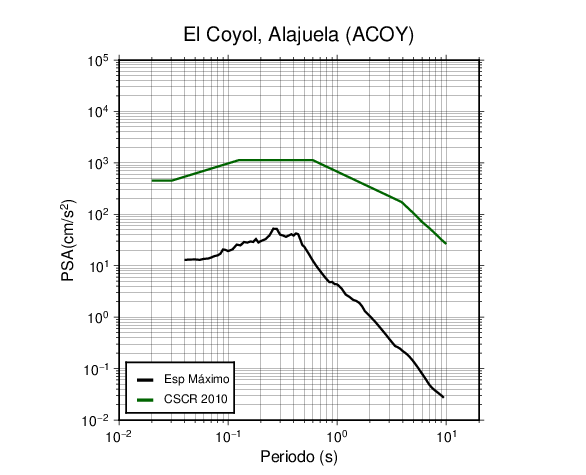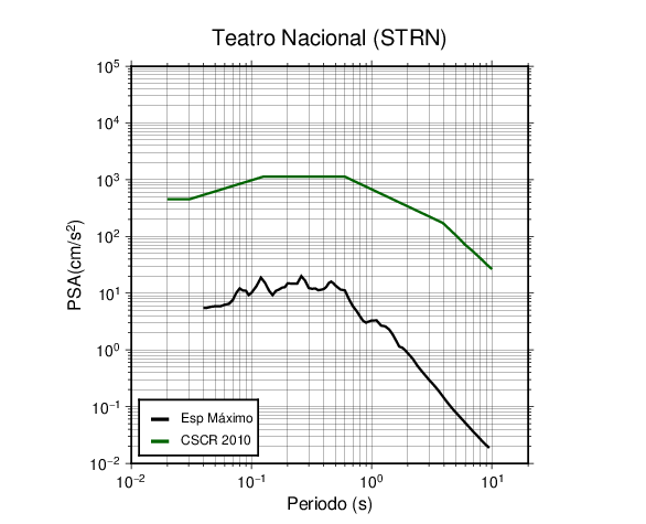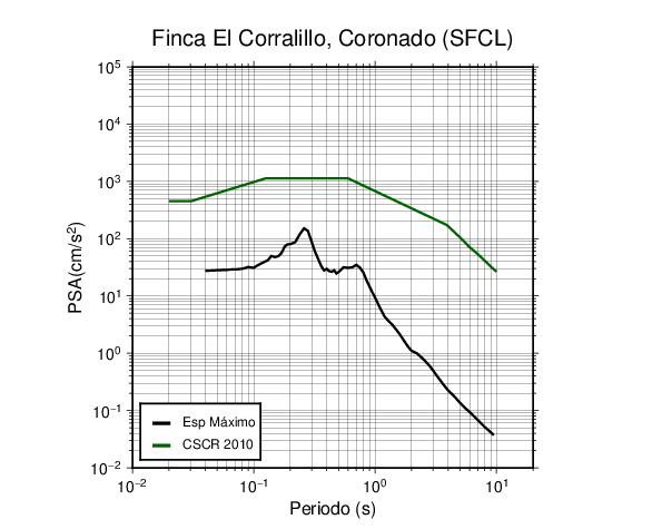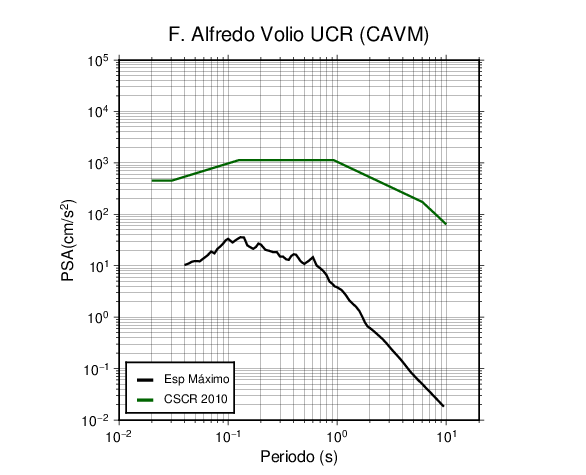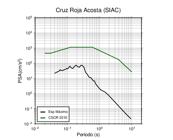 En los siguientes gráficos, la traza verde es el espectro propuesto por el CSCR-2010, la traza negra es el espectro máximo de este sismo. El valor de la amplitud está dado en pseudoaceleración en cm/s2.