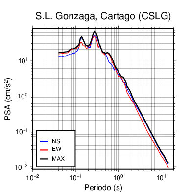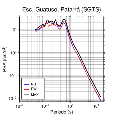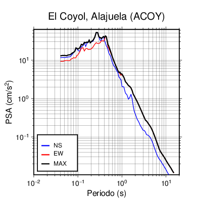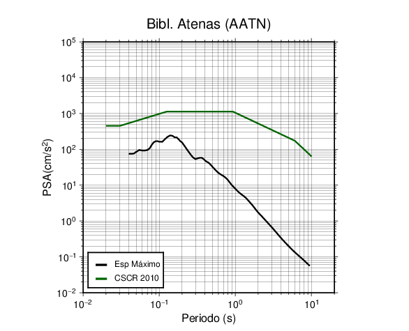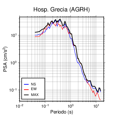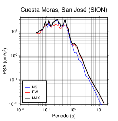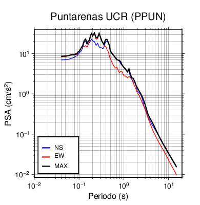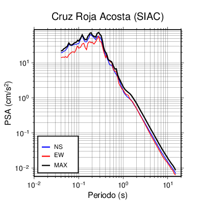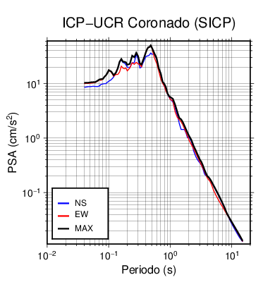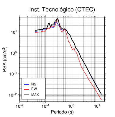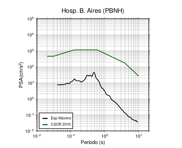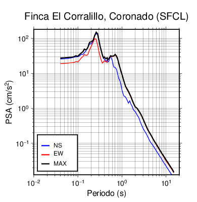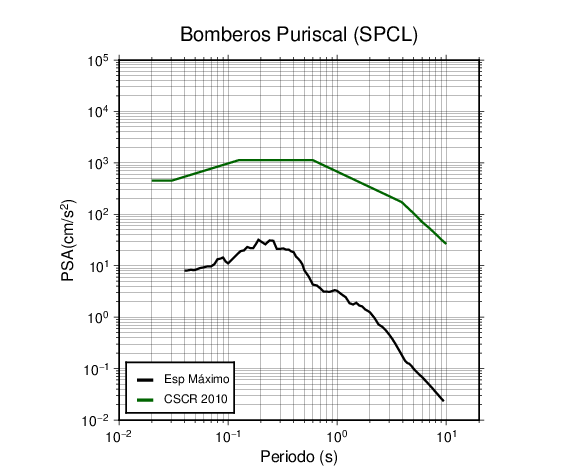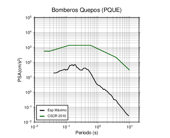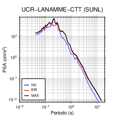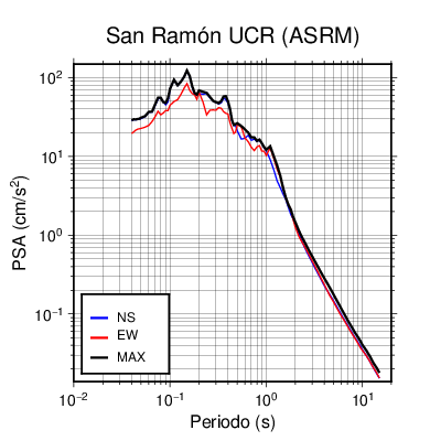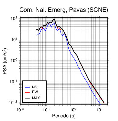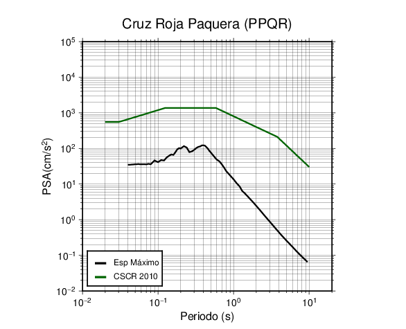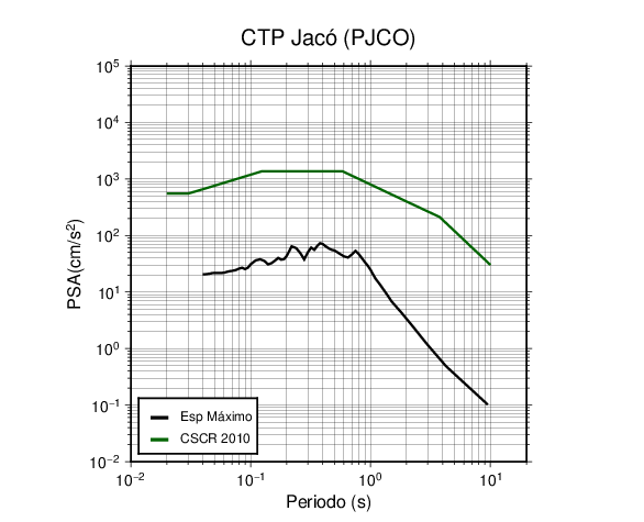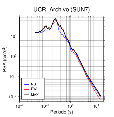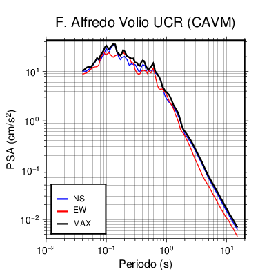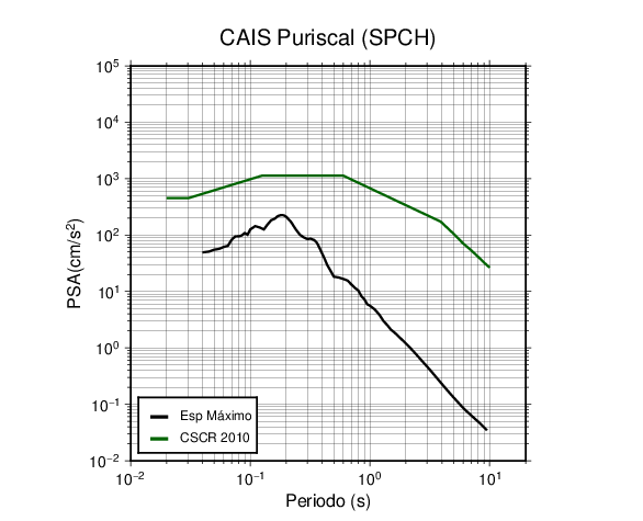 En los siguientes gráficos, la traza verde es el espectro propuesto por el CSCR-2010, la traza negra es el espectro máximo de este sismo. El valor de la amplitud está dado en pseudoaceleración en cm/s2.