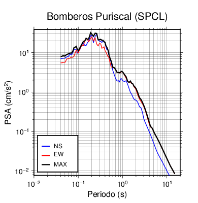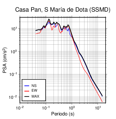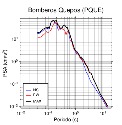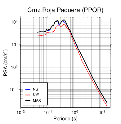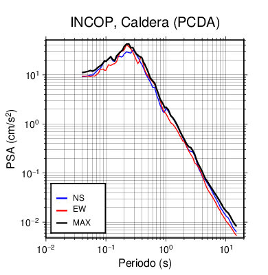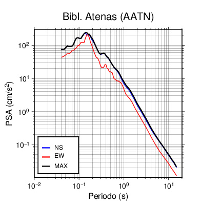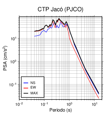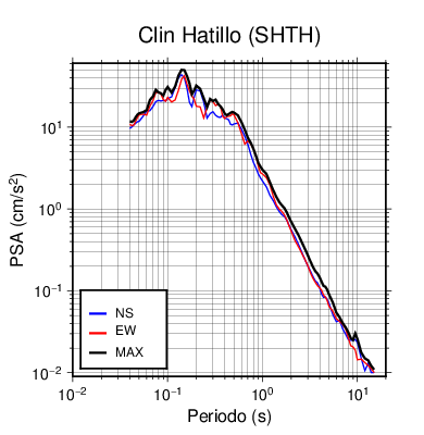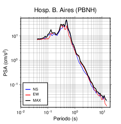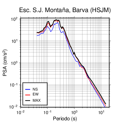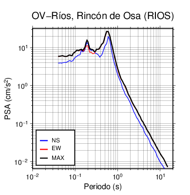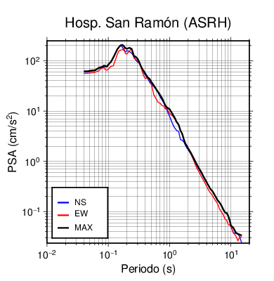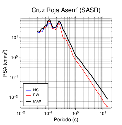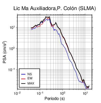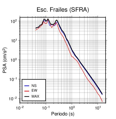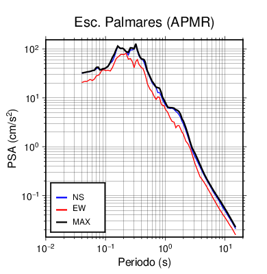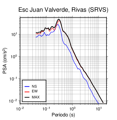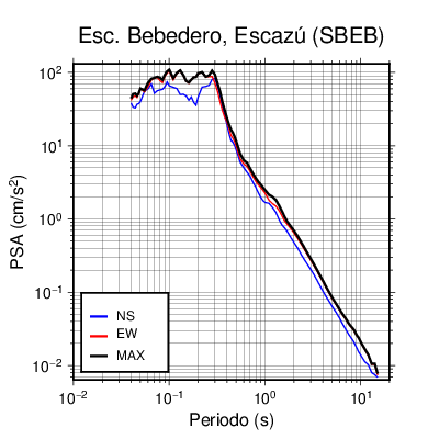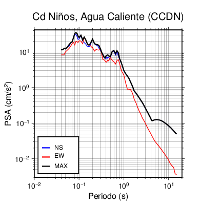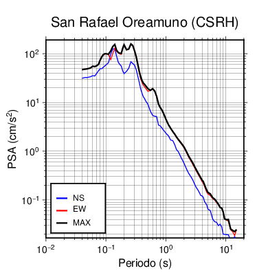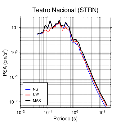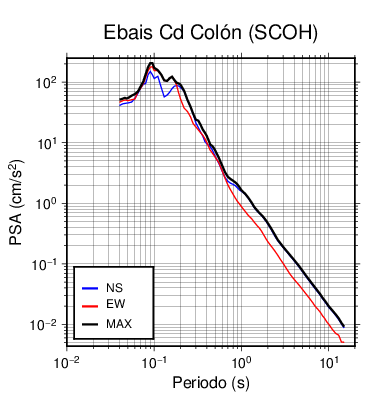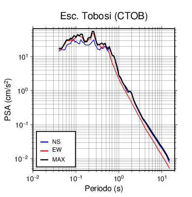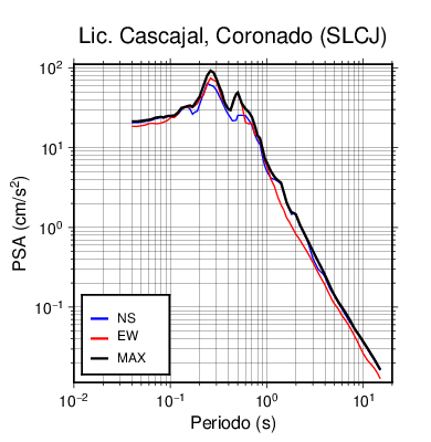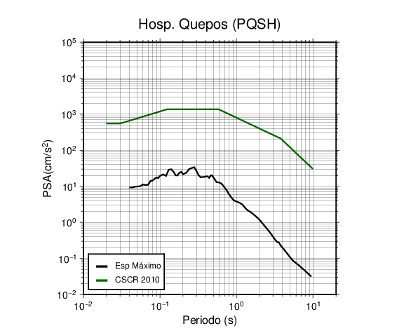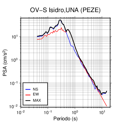 En los siguientes gráficos, la traza verde es el espectro propuesto por el CSCR-2010, la traza negra es el espectro máximo de este sismo. El valor de la amplitud está dado en pseudoaceleración en cm/s2.