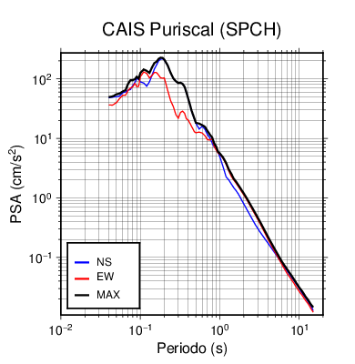 Los espectros de respuesta máxima siempre serán mayores o iguales a los espectros en las direcciones N-S y E-O. Se muestra la comparación para cada una de las estaciones en que se registró el evento.