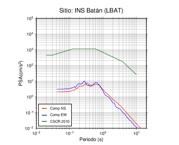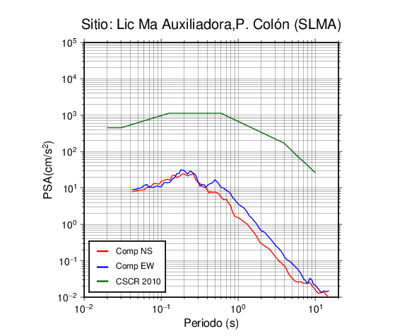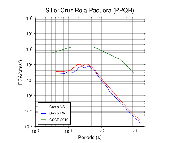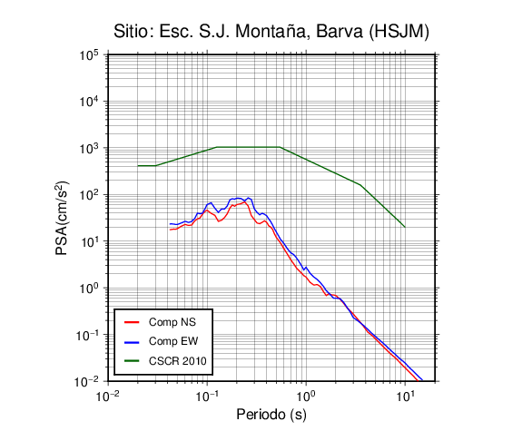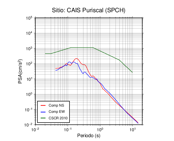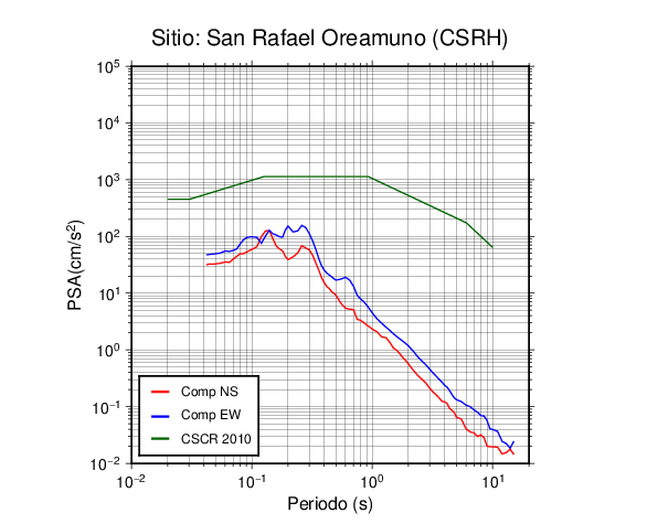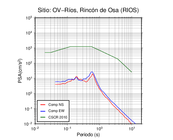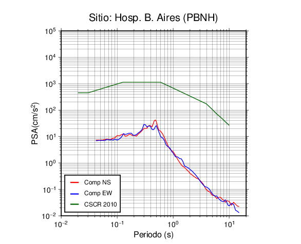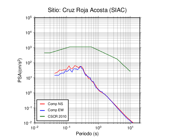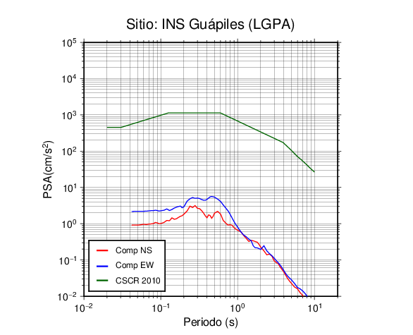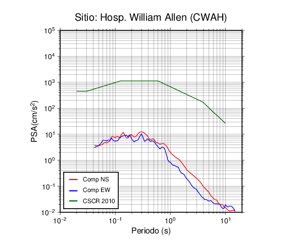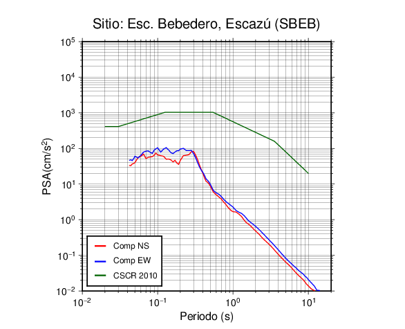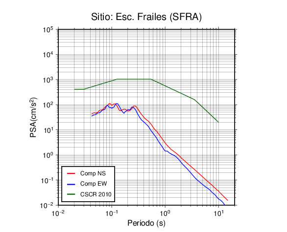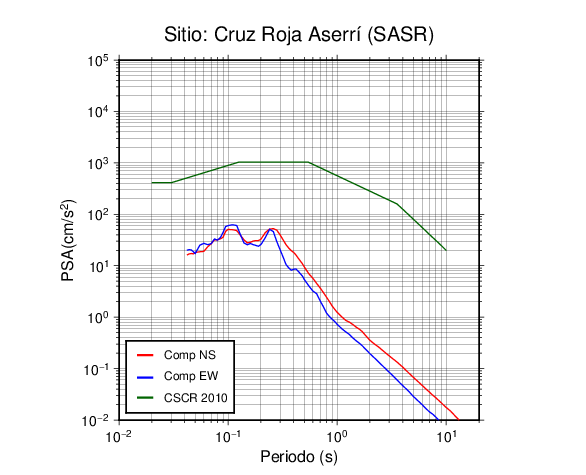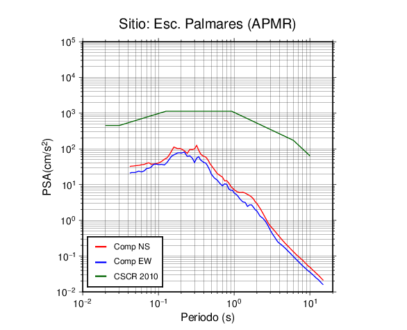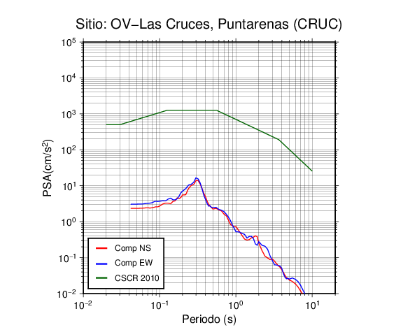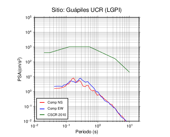 En los siguientes gráficos, la traza verde es el espectro propuesto por el CSCR-2010, la traza roja es el espectro de este sismo en la componente norte-sur (NS) y la traza azul la componente este-oeste (EW). El valor de la amplitud está dado en pseudoaceleración en cm/s2.