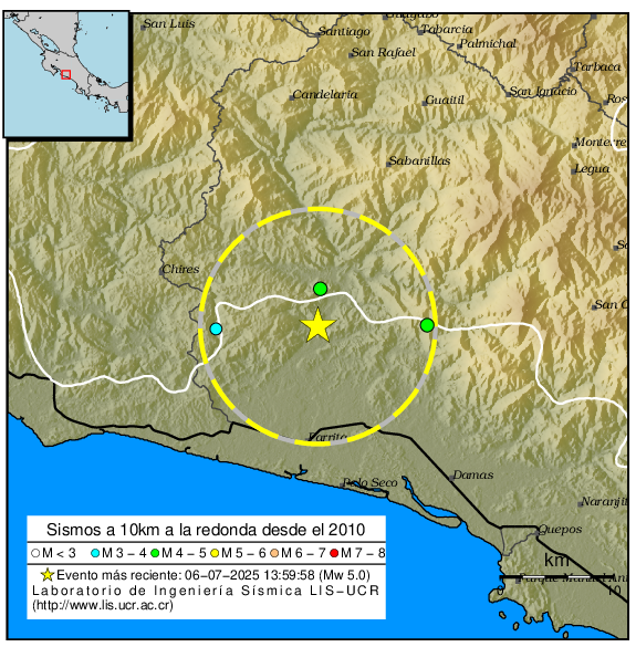 A 10km a la redonda del epicentro, el LISUCR ha localizado también los siguientes 3 sismos ocurridos desde el 2010. Todos ellos con profundidades inferiores a los 40km.