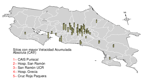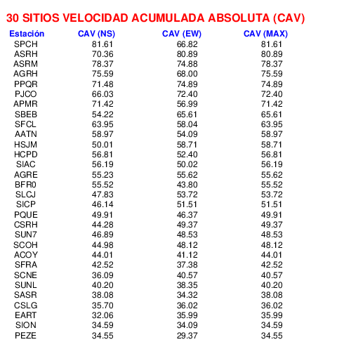 La velocidad acumulada absoluta (CAV por sus siglas en inglés) es otro parámetro que se usa para caracterizar el movimiento fuerte del suelo. Los datos están dados en cm/s para las componentes norte-sur (NS) y este-oeste (EW). El máximo de ambas se da en la tercera columna.