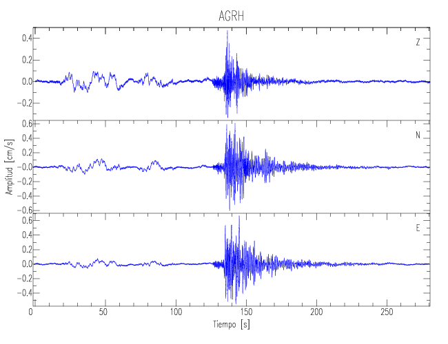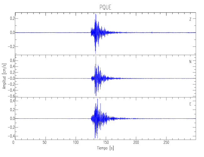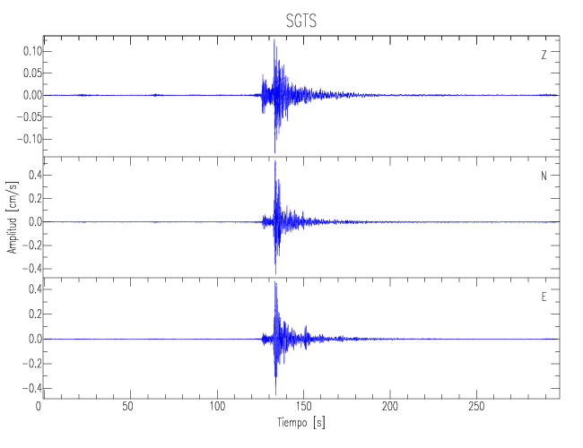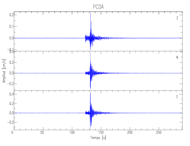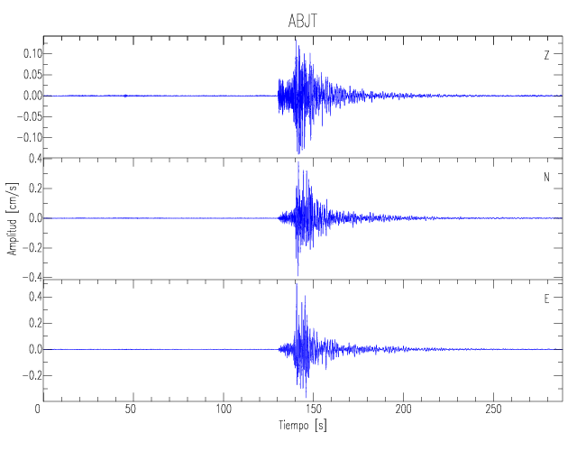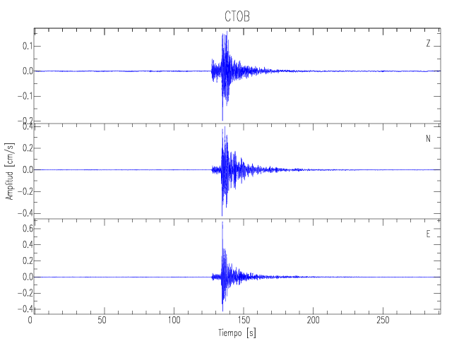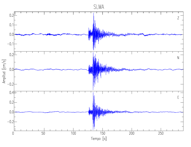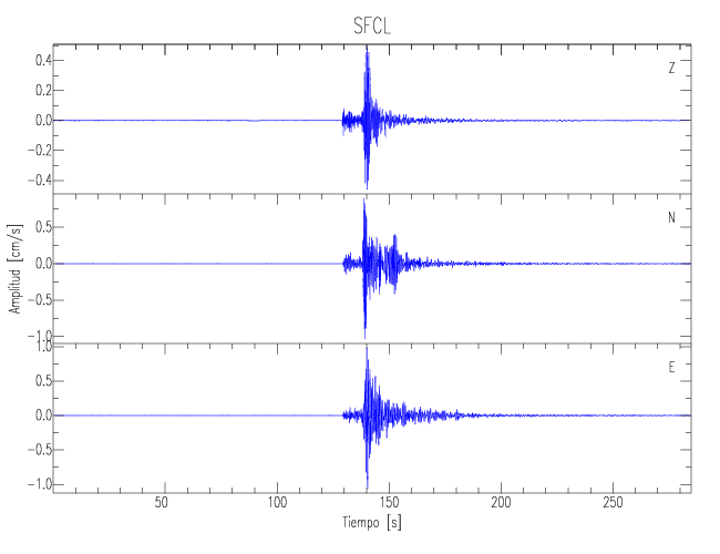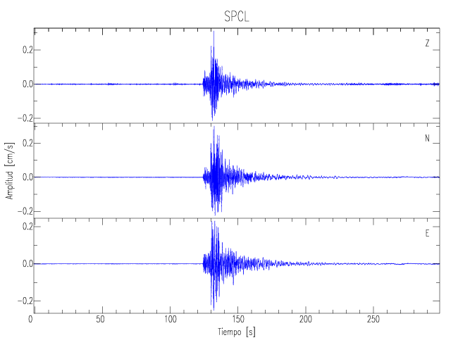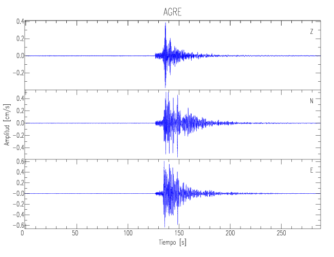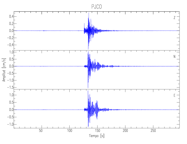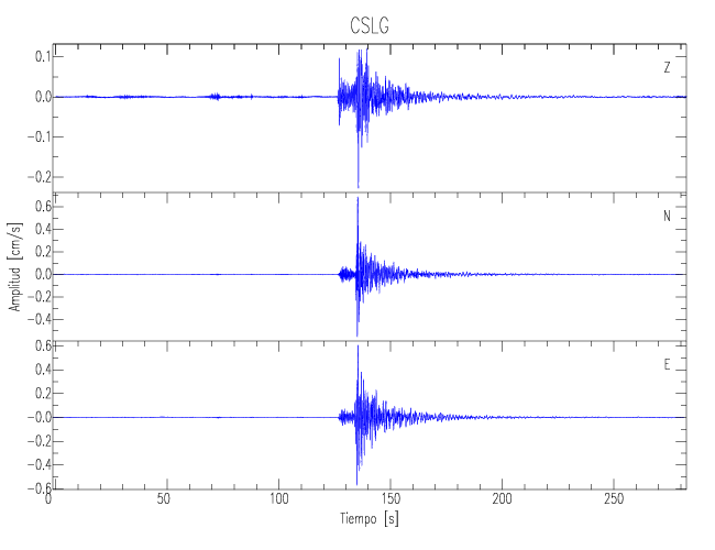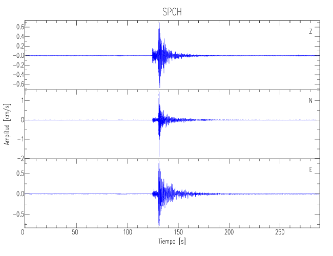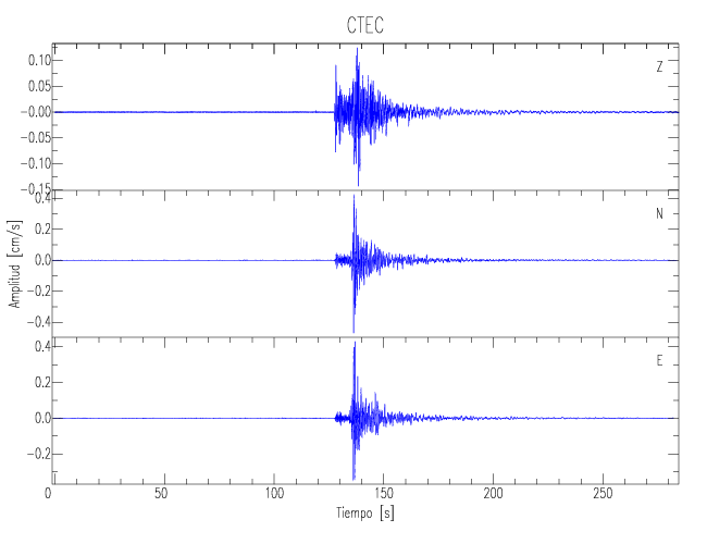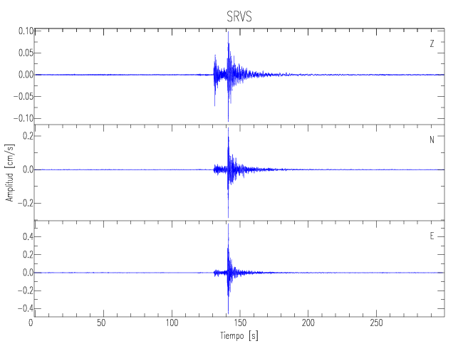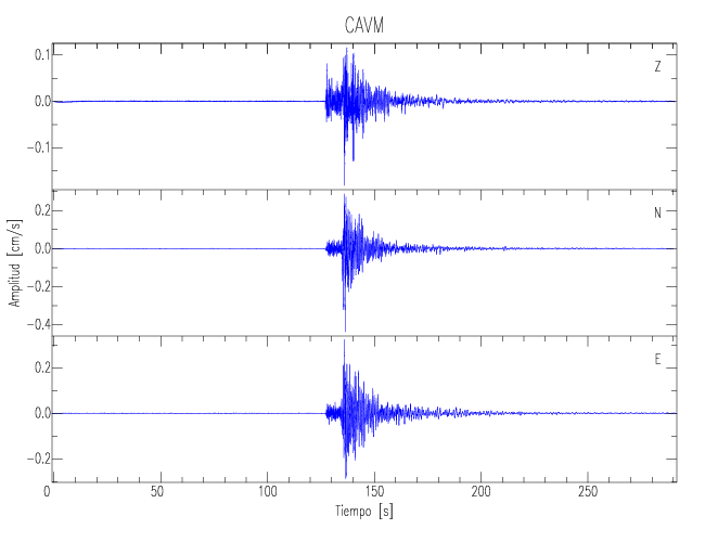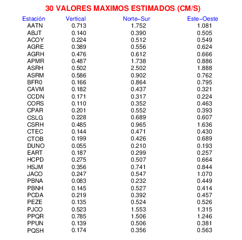 Los registros de velocidad se obtienen de la integración de los datos de aceleración. Esta tabla contiene los valores de velocidad máxima (PGV por sus siglas en inglés) para cada componente en cm/s. Las estaciones se listan en orden alfabético y corresponden a los sitios en que el nivel de aceleración fue superior a los 5 cm/s2.
