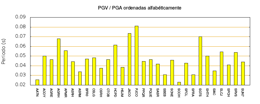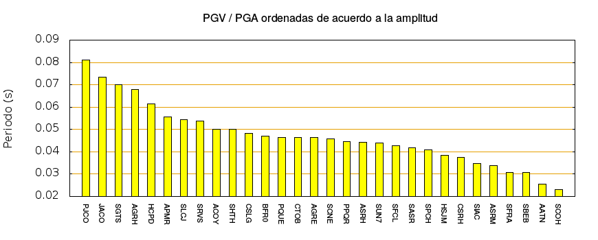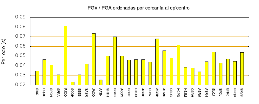 El cociente de la velocidad máxima (PGV) entre la aceleración máxima (PGA) brinda información de los periodos más significativos del movimiento del suelo. En el gráfico siguiente se muestran las estaciones ordenadas por su cercanía al epicentro. La más cercana está a la izquierda y la más lejana a la derecha. También se muestran los mismos datos en orden alfabético y ordenados de mayor a menor amplitud.