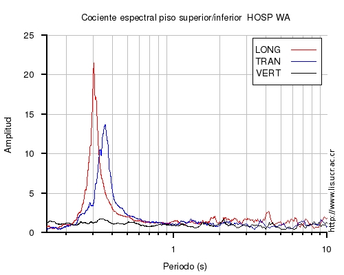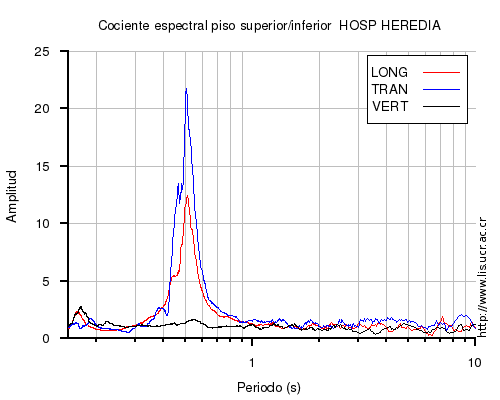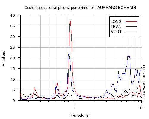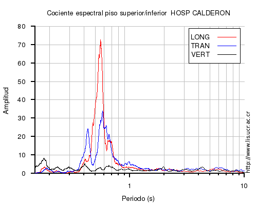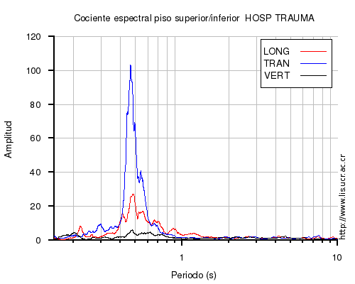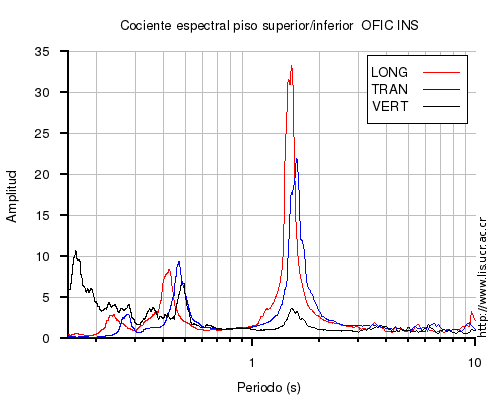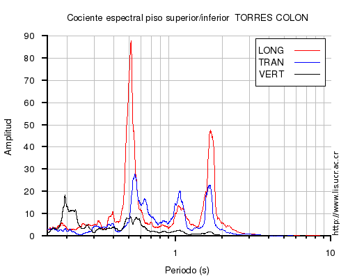 También se muestra el cociente espectral (en el rango de 0.1 a 10 s) entre el nivel superior (sea el último piso o la azotea) e inferior (sea el primero piso o el sótano) para cada una de las componentes LONG=longitudinal, TRAN=transversal y VERT=vertical. En los casos en que el nivel superior o inferior no estén disponibles al momento del sismo, se muestra una imagen con la leyenda "No se pudo calcular".