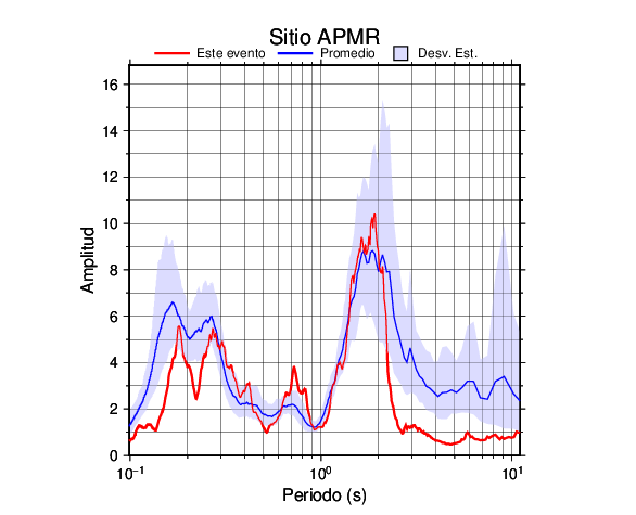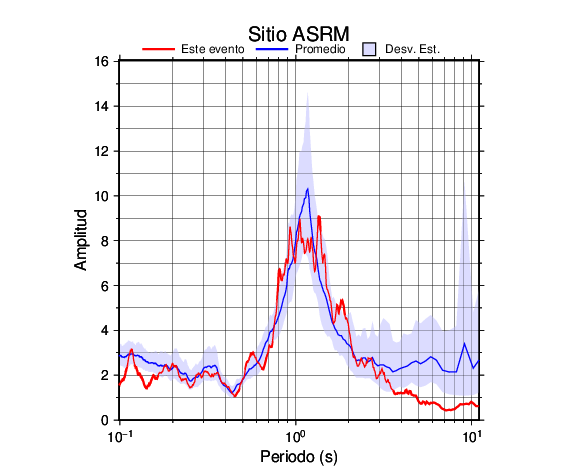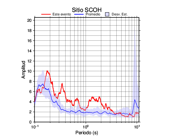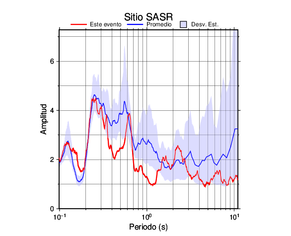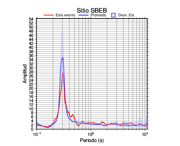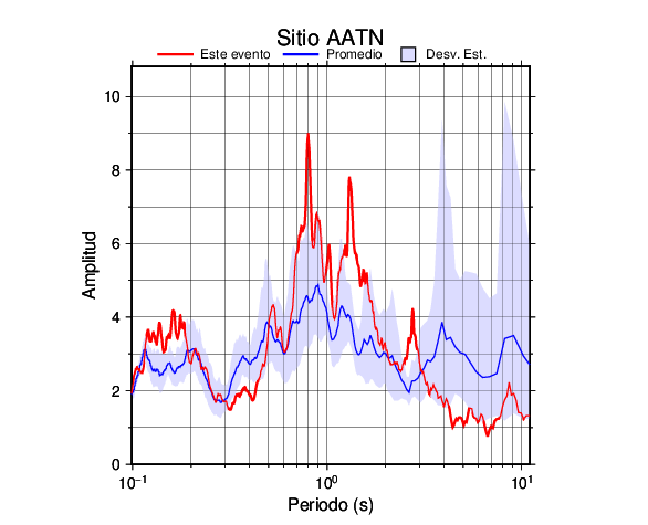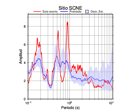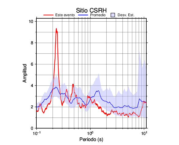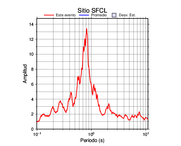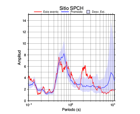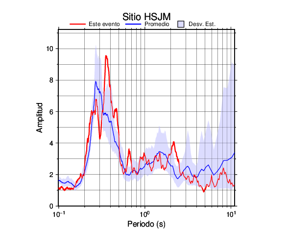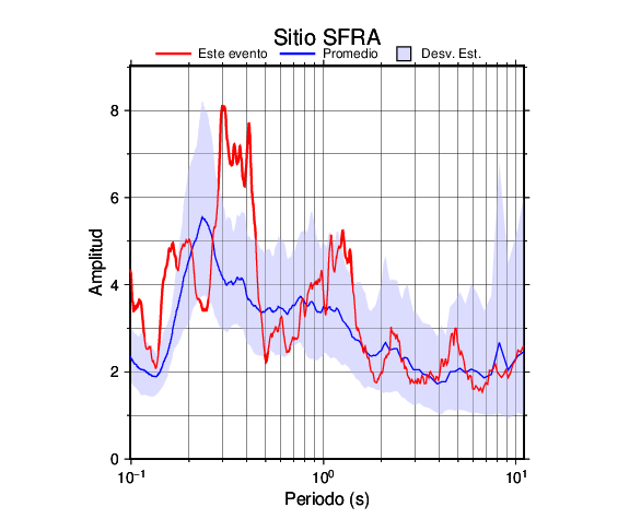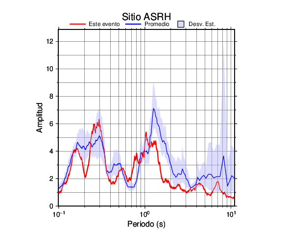 Los resultados que se presentan aquí fueron obtenidos luego de dividir las componentes horizontales entre la componente vertical (conocido como técnica H/V). Se grafica tanto el efecto de sitio del sismo registrado como el valor promedio en cada estación y su correspondiente desviación estándar.