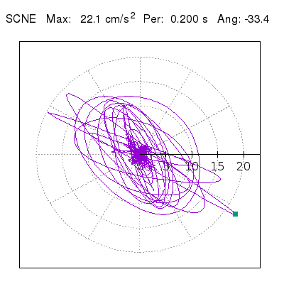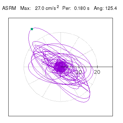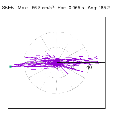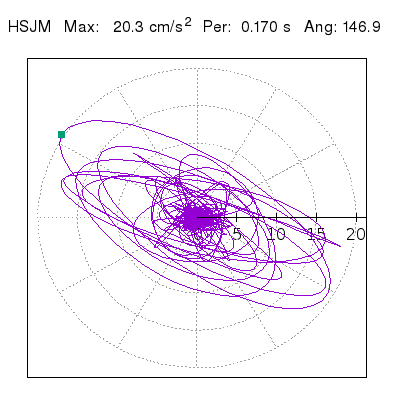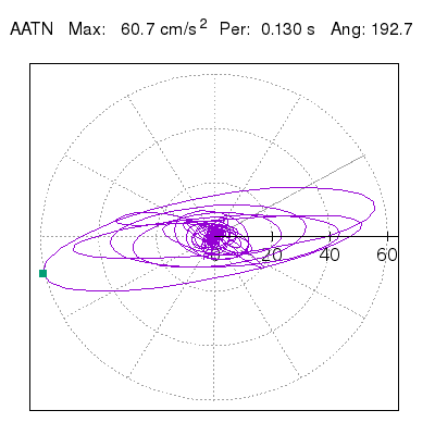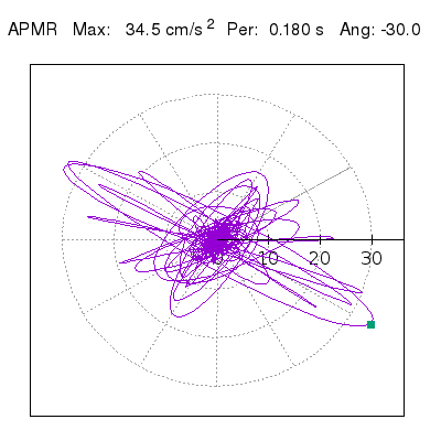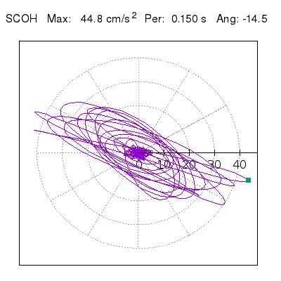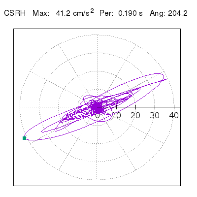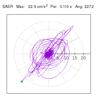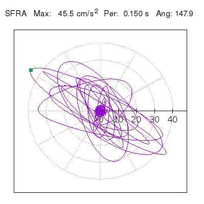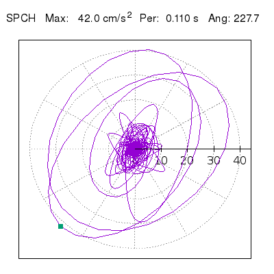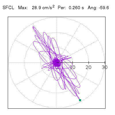 Tomando el periodo en el cual se presenta la amplitud máxima del espectro de respuesta máxima para cada estación, se representa la respuesta bidireccional en función del tiempo sobre el plano horizontal. Se identifica el punto (color verde en cada figura) del cual se desprende la orientación mostrada en el mapa de la sección superior. El valor de la acelereración máxima corresponde al punto del espectro de respuesta para el periodo indicado.