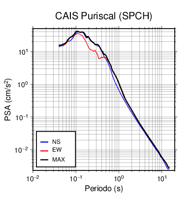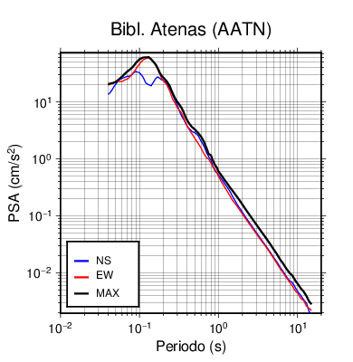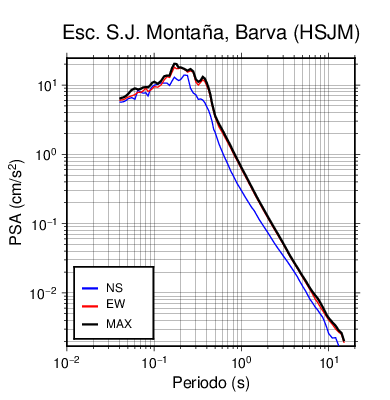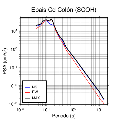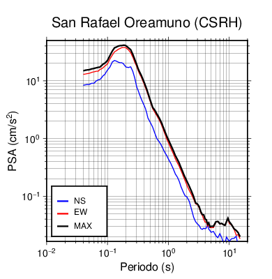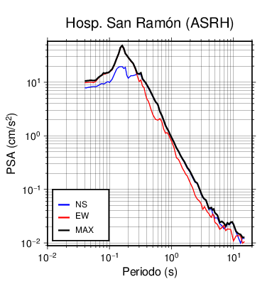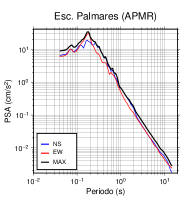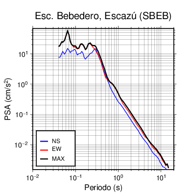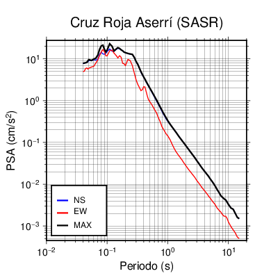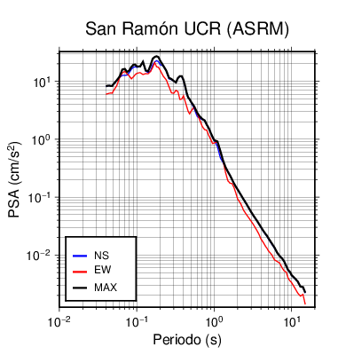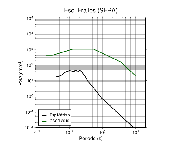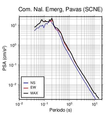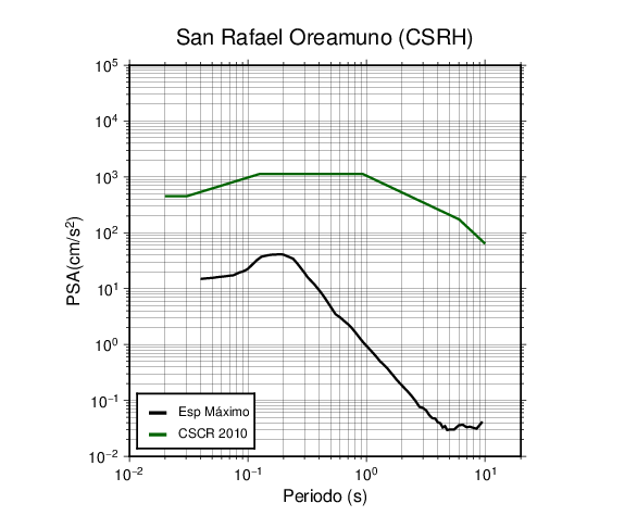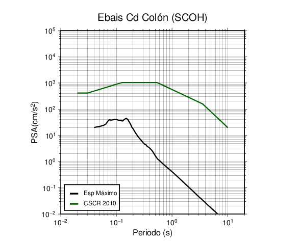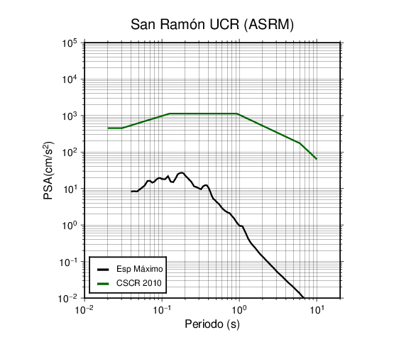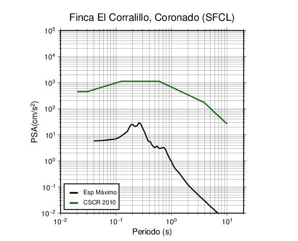En los siguientes gráficos, la traza verde es el espectro propuesto por el CSCR-2010, la traza negra es el espectro máximo de este sismo. El valor de la amplitud está dado en pseudoaceleración en cm/s2.