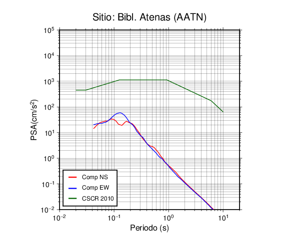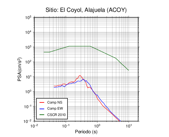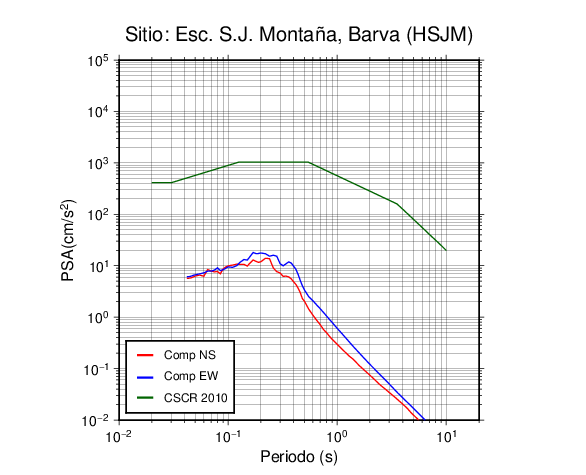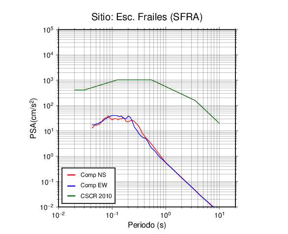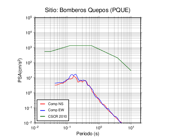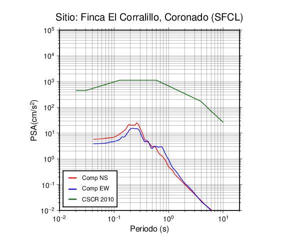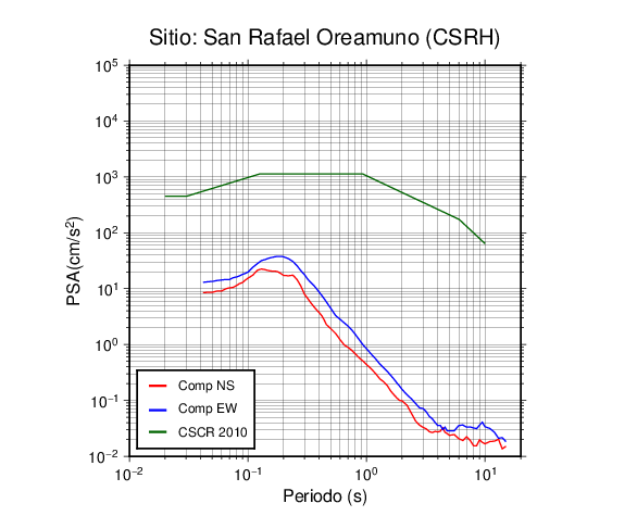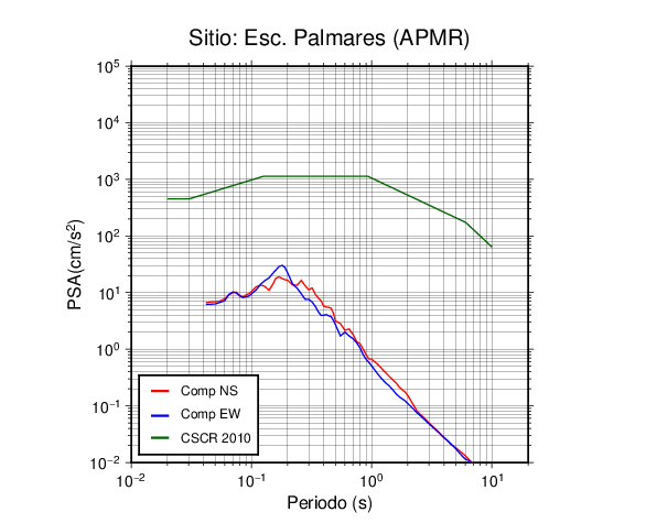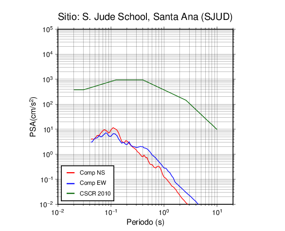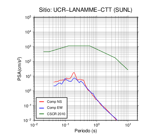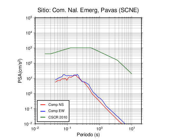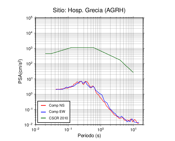 En los siguientes gráficos, la traza verde es el espectro propuesto por el CSCR-2010, la traza roja es el espectro de este sismo en la componente norte-sur (NS) y la traza azul la componente este-oeste (EW). El valor de la amplitud está dado en pseudoaceleración en cm/s2.