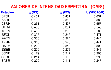 En esta sección se muestra el cáculo de la intensidad de Housner, IH para la componente norte-sur (NS) y este-oeste (EW) y la suma vectorial de los registros de aceleración que tuvieron valores superiores a los 5 cm/s2.