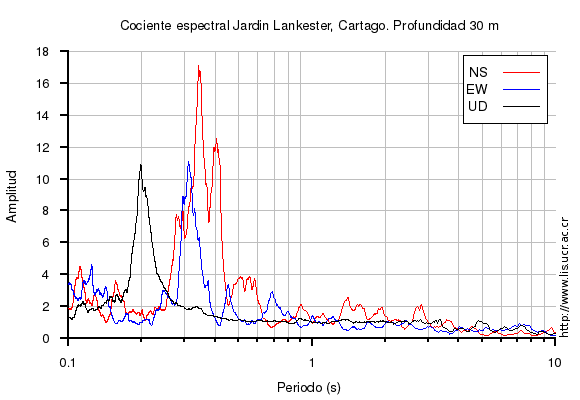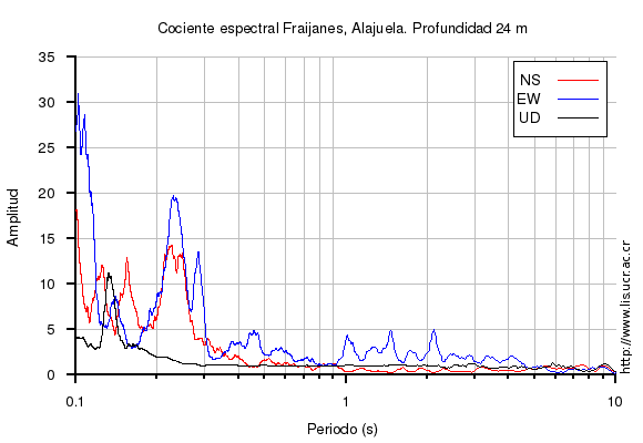 El cociente espectral se obtuvo dividiendo el espectro de amplitud de la componente en superficie con respecto a la componente en profundidad (NS=norte-sur, EW=este-oeste, UD=vertical)