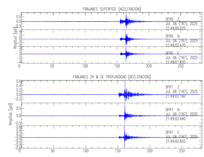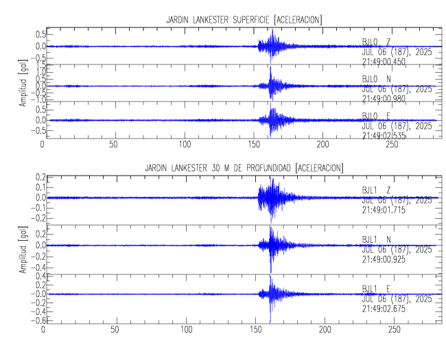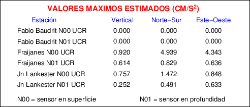Aquí se muestran las formas de onda y cocientes espectrales de los sensores colocados en pozo . Uno se ubica en el Jardín Lankester en Paraíso de Cartago con 30 m de profundidad y el otro en la Estación Experimental Fabio Baudrit en Alajuela con 40 m de profundidad. La tabla muestra los valores de aceleración máxima (PGA) leídos de las tres componentes en superficie (N00) y en profundidad (N01)
