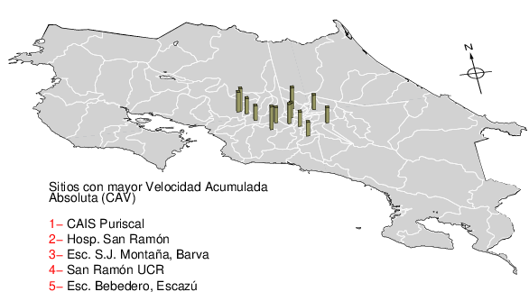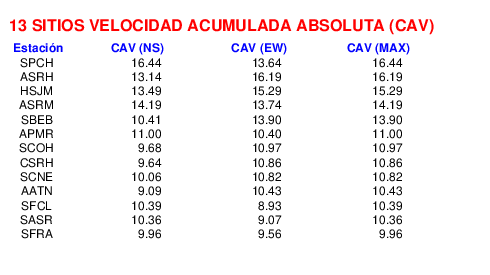 La velocidad acumulada absoluta (CAV por sus siglas en inglés) es otro parámetro que se usa para caracterizar el movimiento fuerte del suelo. Los datos están dados en cm/s para las componentes norte-sur (NS) y este-oeste (EW). El máximo de ambas se da en la tercera columna.