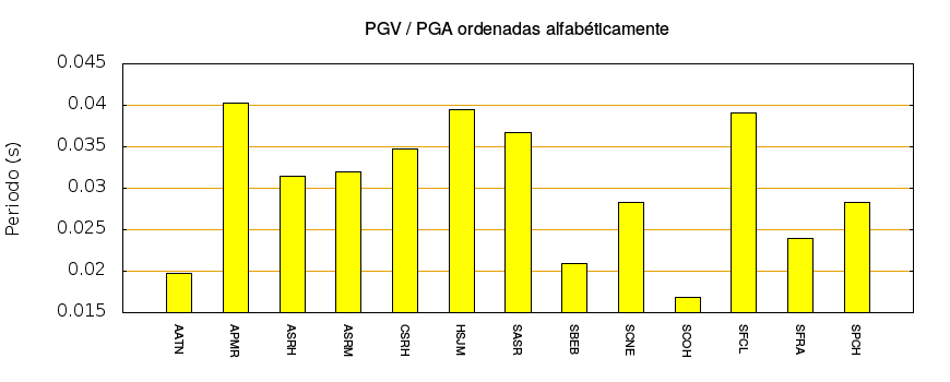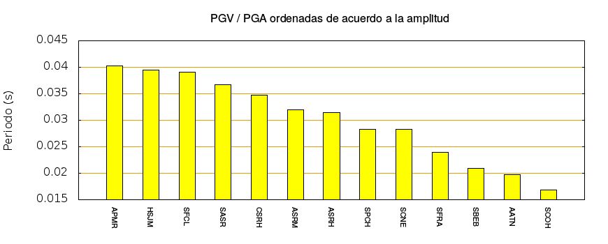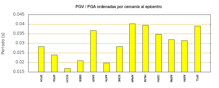 El cociente de la velocidad máxima (PGV) entre la aceleración máxima (PGA) brinda información de los periodos más significativos del movimiento del suelo. En el gráfico siguiente se muestran las estaciones ordenadas por su cercanía al epicentro. La más cercana está a la izquierda y la más lejana a la derecha. También se muestran los mismos datos en orden alfabético y ordenados de mayor a menor amplitud.