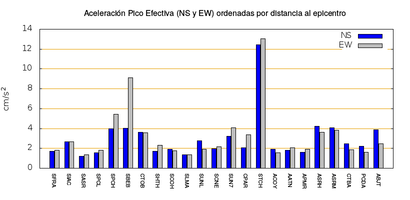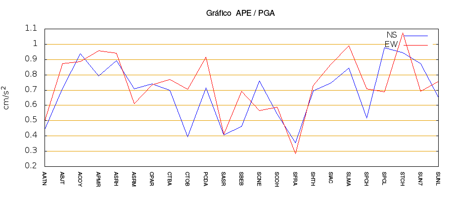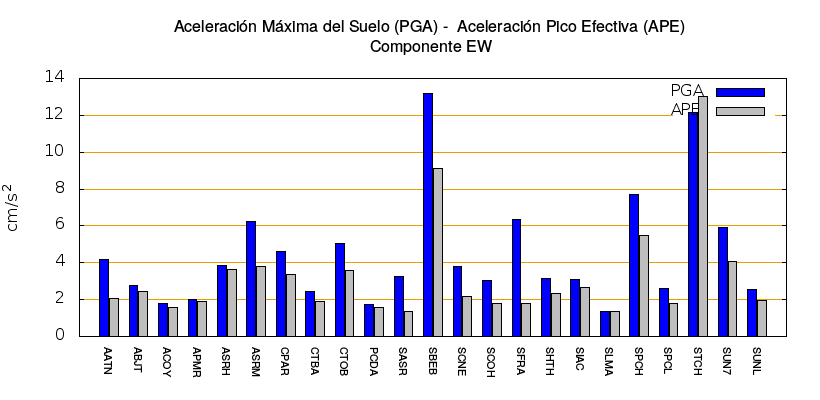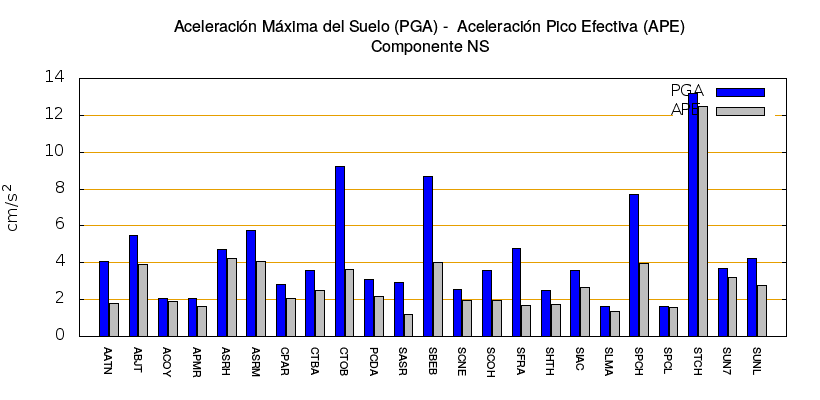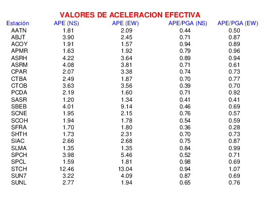 La siguiente tabla muestra los valores de aceleración efectiva para las componentes norte-sur (NS) y este-oeste (EW). También se muestra el valor del cociente entre la aceleración efectiva y la aceleración máxima (APE/PGA).