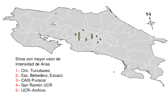 Mapa mostrando la IA en cada sitio de registro. Se grafica el valor máximo de la tabla anterior.