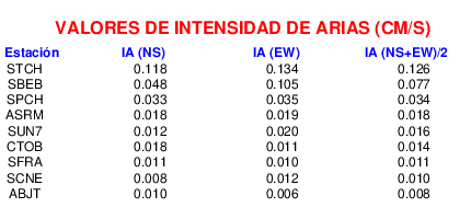 En esta sección se muestra el cáculo de la IA para la componente norte-sur (NS) y este-oeste (EW) de los registros de aceleración que tuvieron valores superiores a los 5 cm/s2, así como el valor total de esta que corresponde al promedio de ambas componentes horizontales.