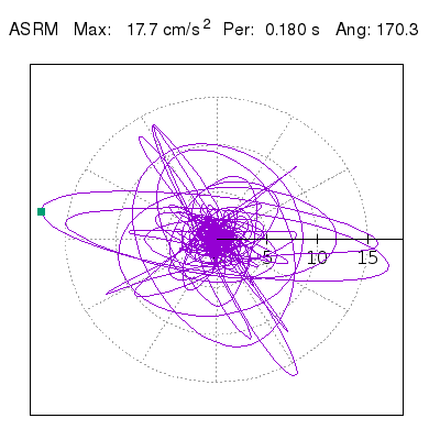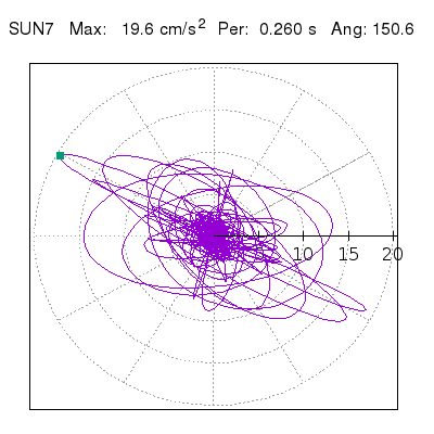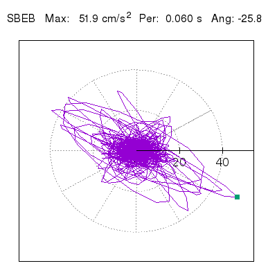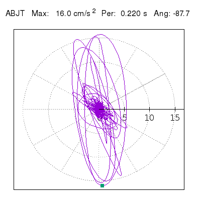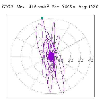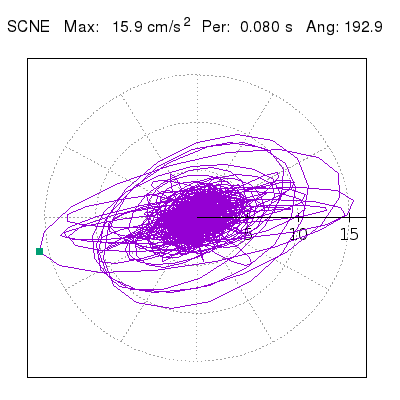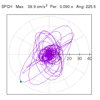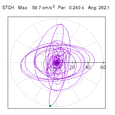 Tomando el periodo en el cual se presenta la amplitud máxima del espectro de respuesta máxima para cada estación, se representa la respuesta bidireccional en función del tiempo sobre el plano horizontal. Se identifica el punto (color verde en cada figura) del cual se desprende la orientación mostrada en el mapa de la sección superior. El valor de la acelereración máxima corresponde al punto del espectro de respuesta para el periodo indicado.