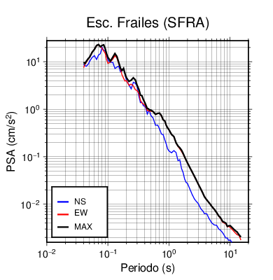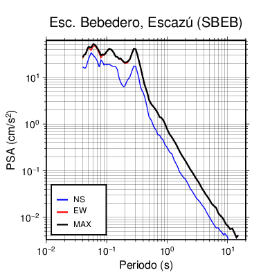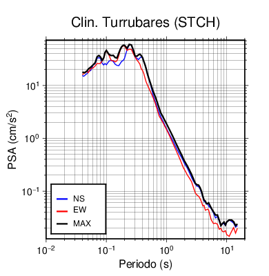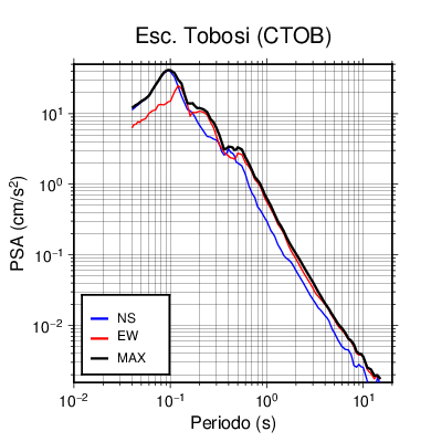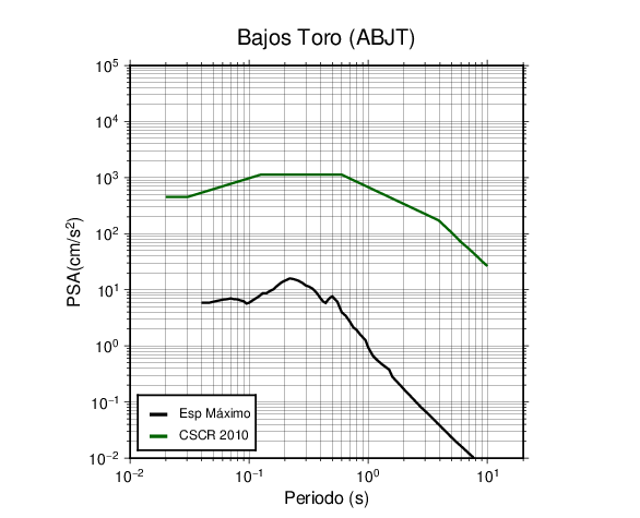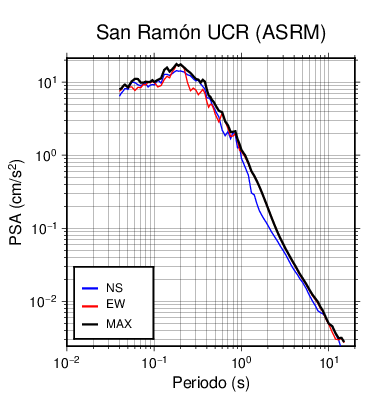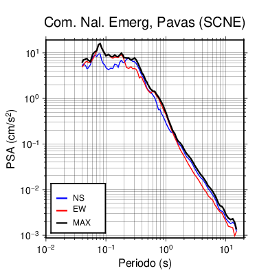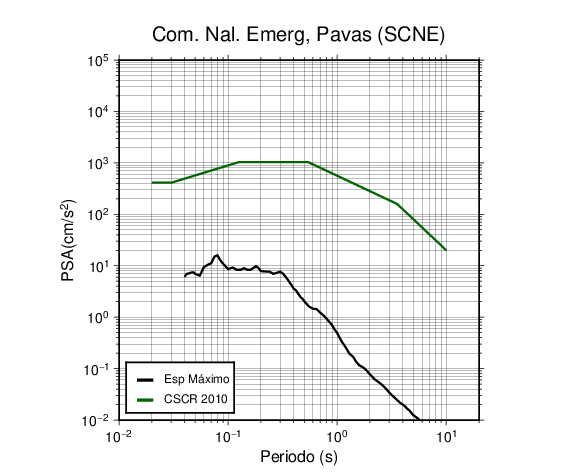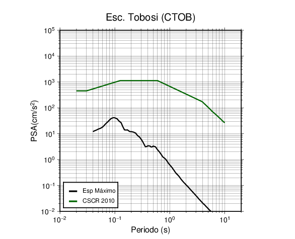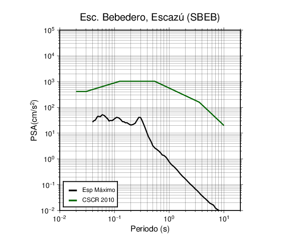 En los siguientes gráficos, la traza verde es el espectro propuesto por el CSCR-2010, la traza negra es el espectro máximo de este sismo. El valor de la amplitud está dado en pseudoaceleración en cm/s2.