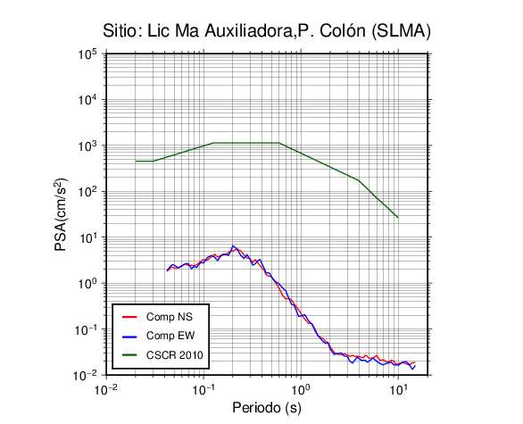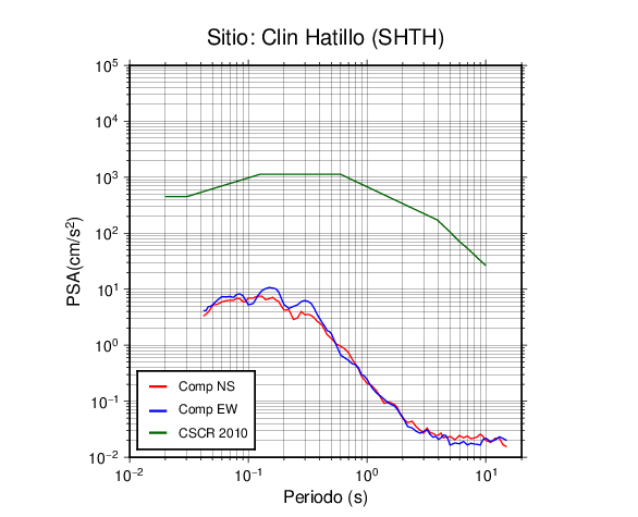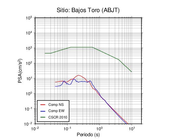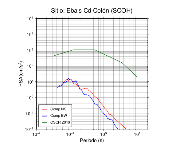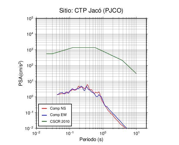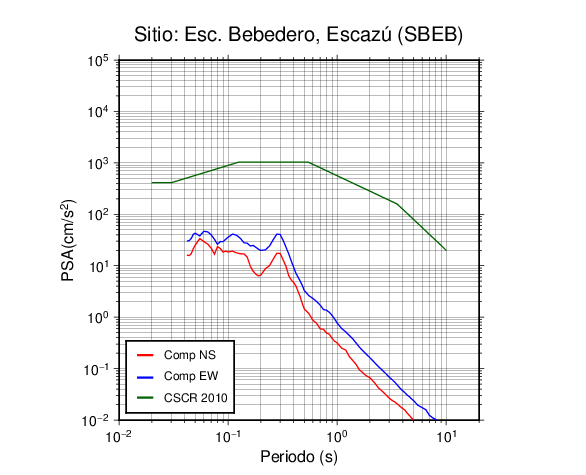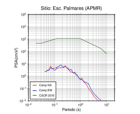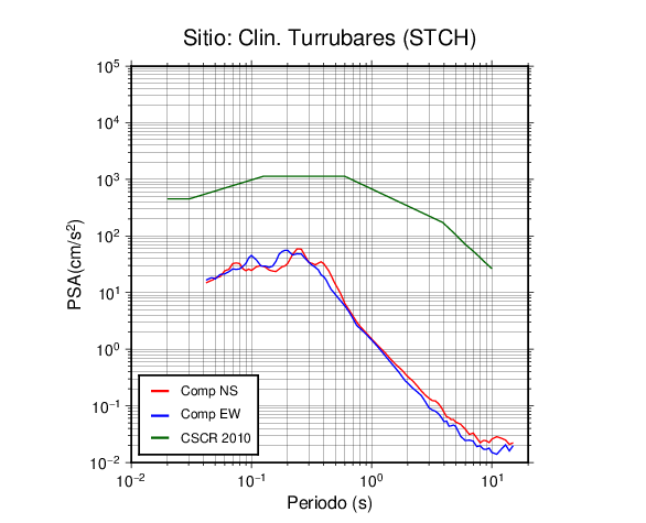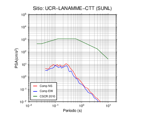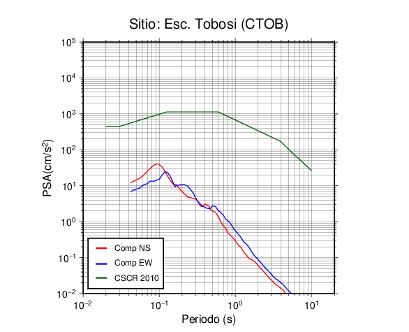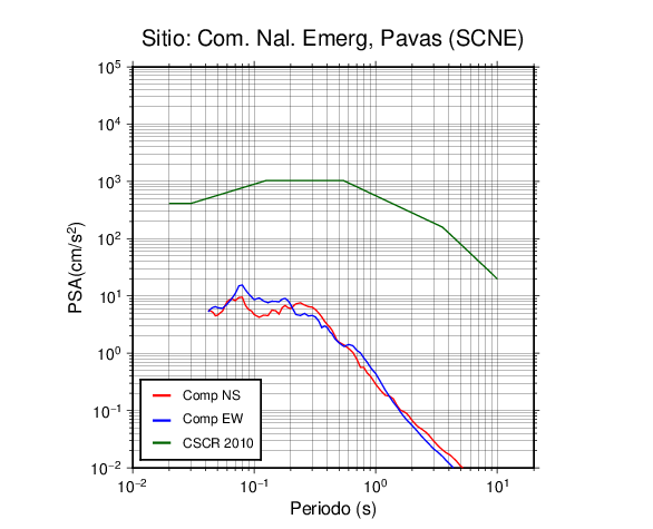 En los siguientes gráficos, la traza verde es el espectro propuesto por el CSCR-2010, la traza roja es el espectro de este sismo en la componente norte-sur (NS) y la traza azul la componente este-oeste (EW). El valor de la amplitud está dado en pseudoaceleración en cm/s2.