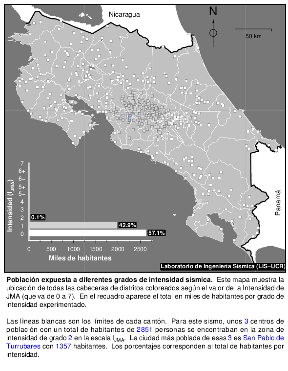 Cada punto sobre el mapa es la cabecera de un distrito. El número de habitantes que hay en cada uno se suma si se encuentra dentro de una misma zona de intensidad sísmica y el total se muestra en el recuadro en manera de porcentajes del total de la población y en miles de habitantes.