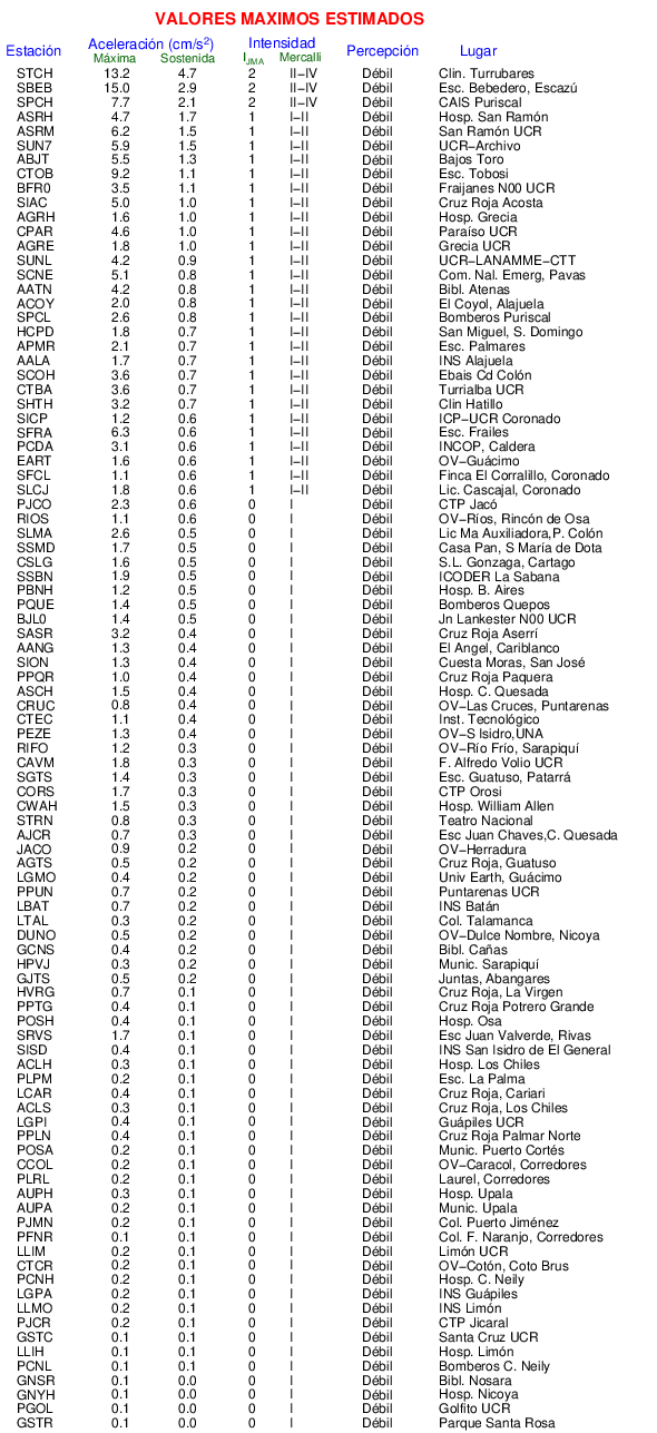La siguiente tabla muestra los valores de Aceleración Máxima o aceleración pico (PGA por sus siglas en inglés). Este es el valor máximo en cualquiera de las 3 componentes del registro.