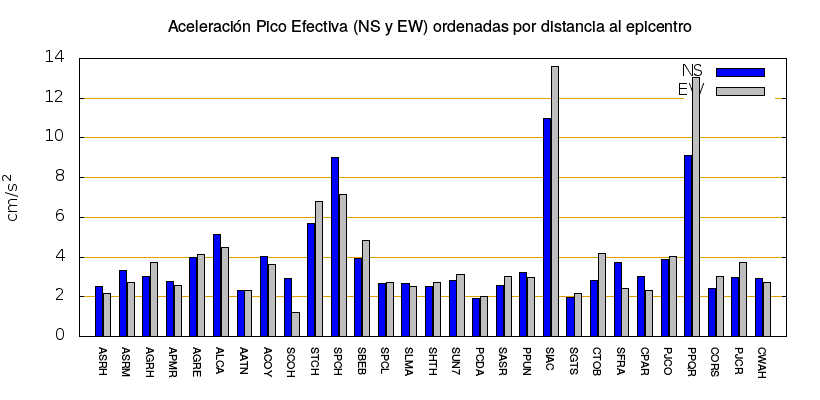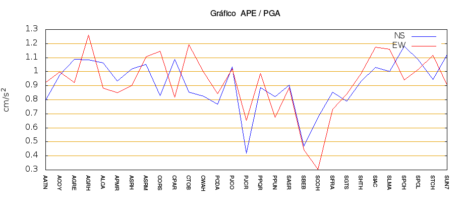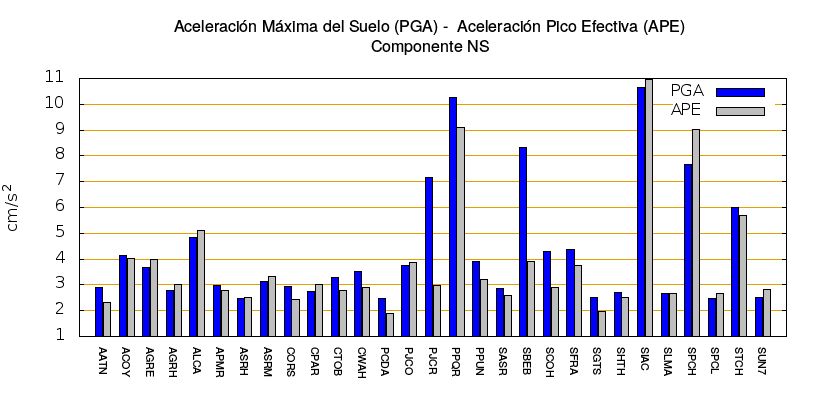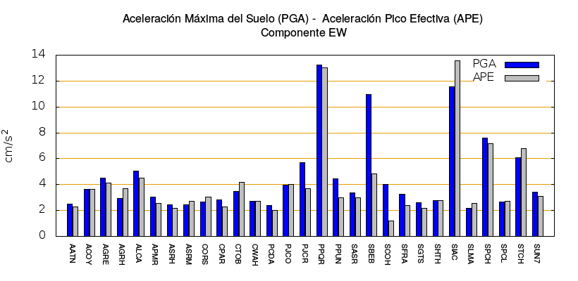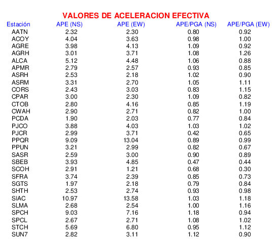 La siguiente tabla muestra los valores de aceleración efectiva para las componentes norte-sur (NS) y este-oeste (EW). También se muestra el valor del cociente entre la aceleración efectiva y la aceleración máxima (APE/PGA).