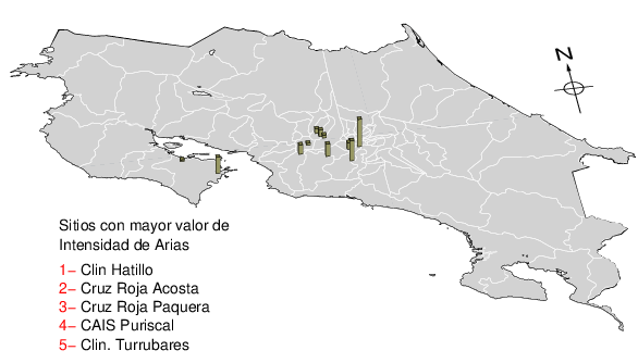 Mapa mostrando la IA en cada sitio de registro. Se grafica el valor máximo de la tabla anterior.