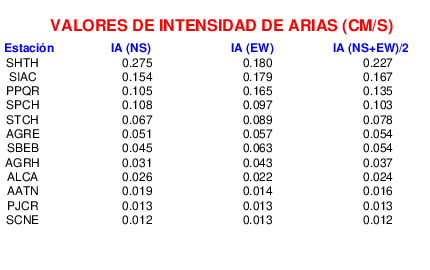 En esta sección se muestra el cáculo de la IA para la componente norte-sur (NS) y este-oeste (EW) de los registros de aceleración que tuvieron valores superiores a los 5 cm/s2, así como el valor total de esta que corresponde al promedio de ambas componentes horizontales.