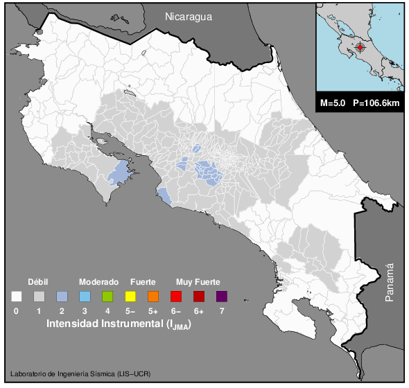 Este mapa muestra la división política de Costa Rica a nivel de distritos. Según nuestros cálculos, la intensidad de grado 2 o superior en la escala de JMA (que varía de 0 a 7) afectó un total de 24 distritos. La lista de estos se muestra bajo del mapa en orden alfabético.