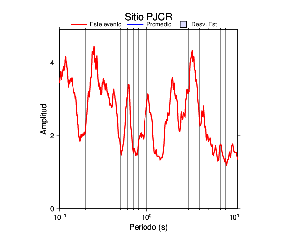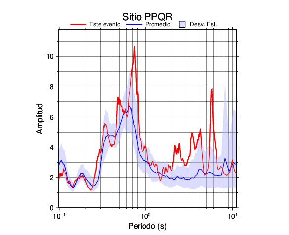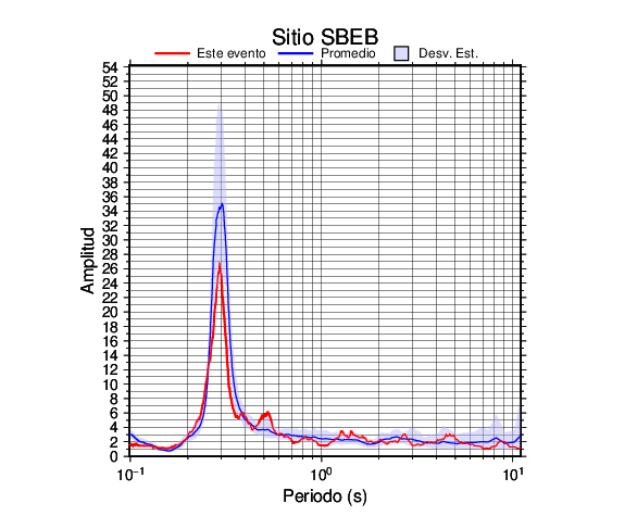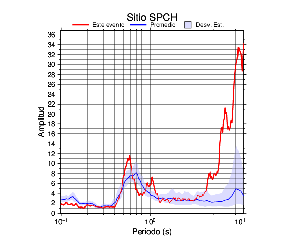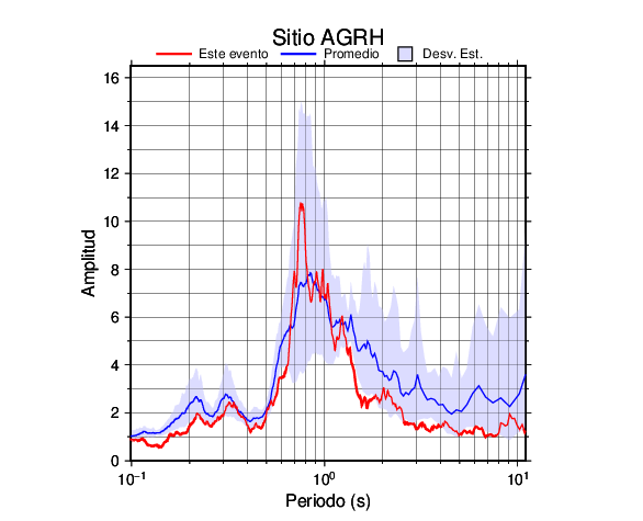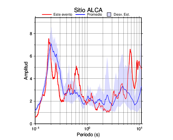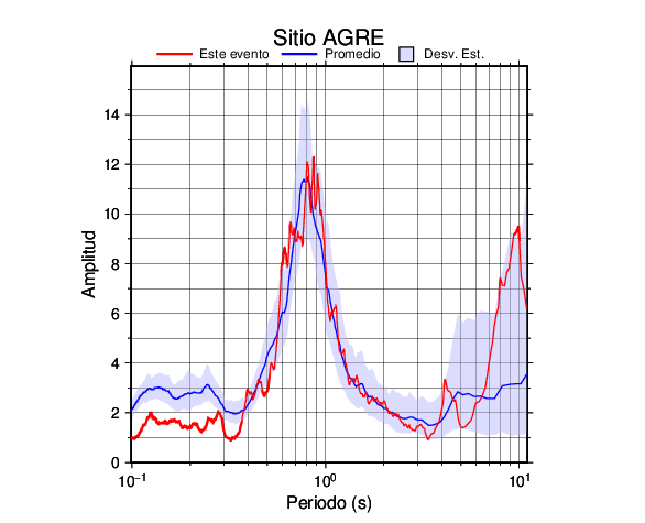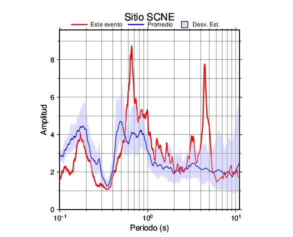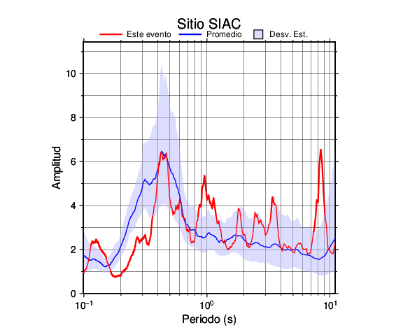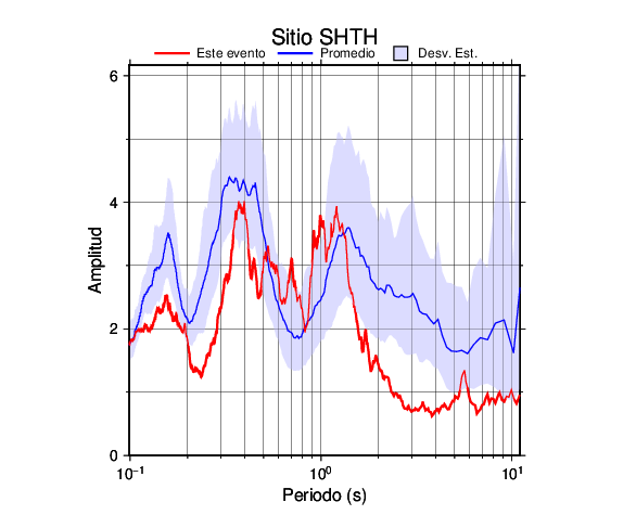 Los resultados que se presentan aquí fueron obtenidos luego de dividir las componentes horizontales entre la componente vertical (conocido como técnica H/V). Se grafica tanto el efecto de sitio del sismo registrado como el valor promedio en cada estación y su correspondiente desviación estándar.