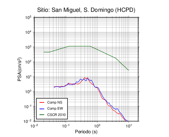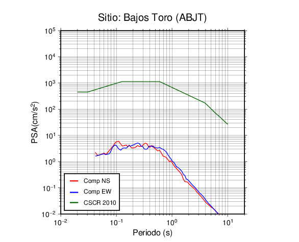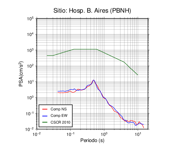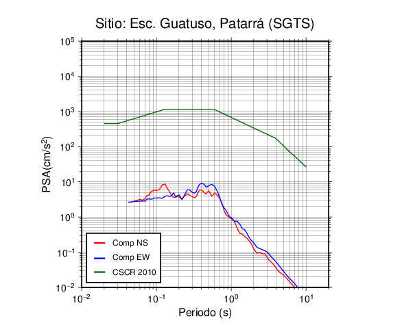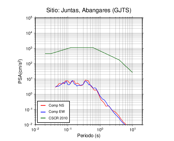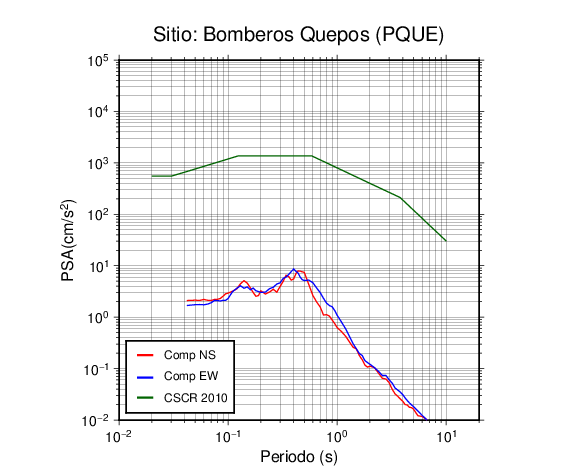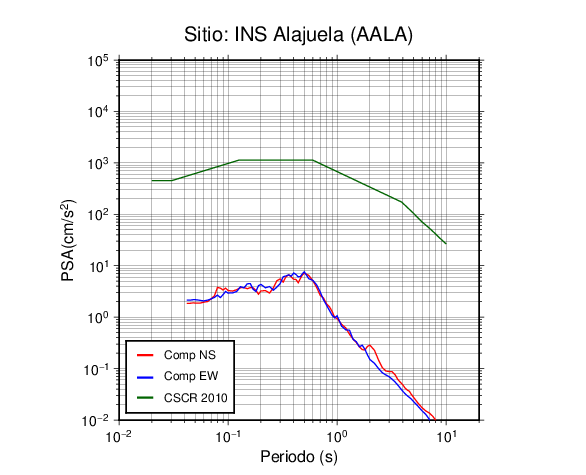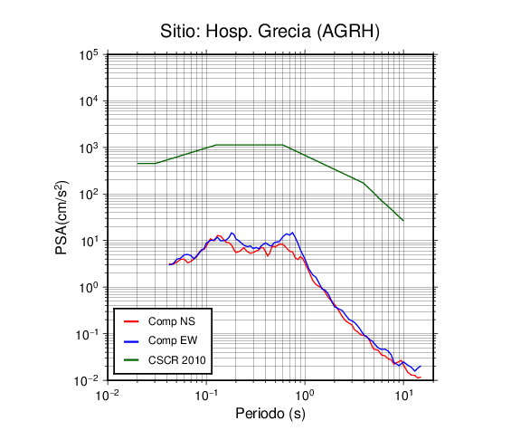 En los siguientes gráficos, la traza verde es el espectro propuesto por el CSCR-2010, la traza roja es el espectro de este sismo en la componente norte-sur (NS) y la traza azul la componente este-oeste (EW). El valor de la amplitud está dado en pseudoaceleración en cm/s2.