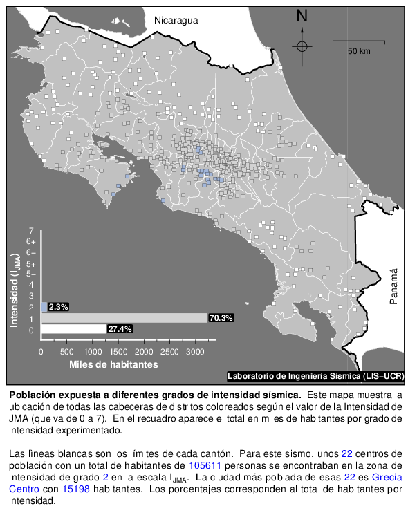 Cada punto sobre el mapa es la cabecera de un distrito. El número de habitantes que hay en cada uno se suma si se encuentra dentro de una misma zona de intensidad sísmica y el total se muestra en el recuadro en manera de porcentajes del total de la población y en miles de habitantes.