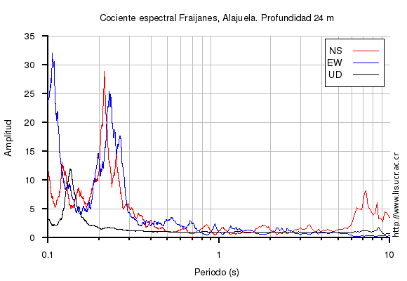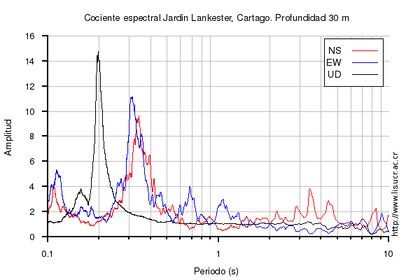 El cociente espectral se obtuvo dividiendo el espectro de amplitud de la componente en superficie con respecto a la componente en profundidad (NS=norte-sur, EW=este-oeste, UD=vertical)
