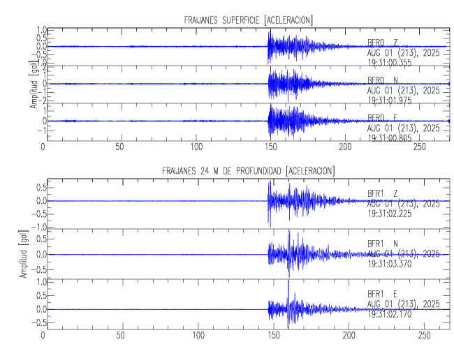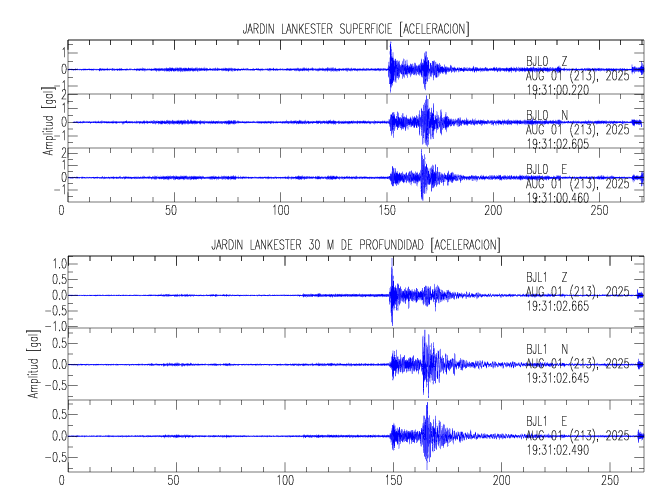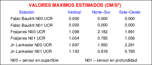 Aquí se muestran las formas de onda y cocientes espectrales de los sensores colocados en pozo . Uno se ubica en el Jardín Lankester en Paraíso de Cartago con 30 m de profundidad y el otro en la Estación Experimental Fabio Baudrit en Alajuela con 40 m de profundidad. La tabla muestra los valores de aceleración máxima (PGA) leídos de las tres componentes en superficie (N00) y en profundidad (N01)