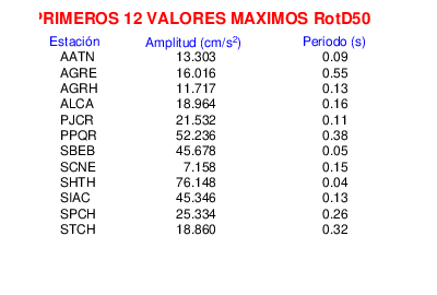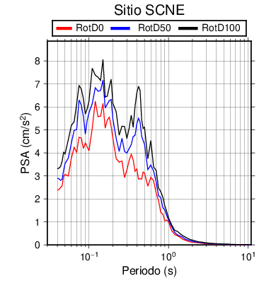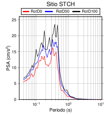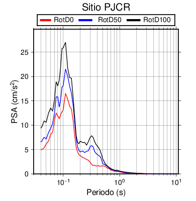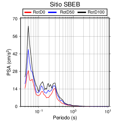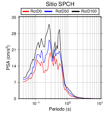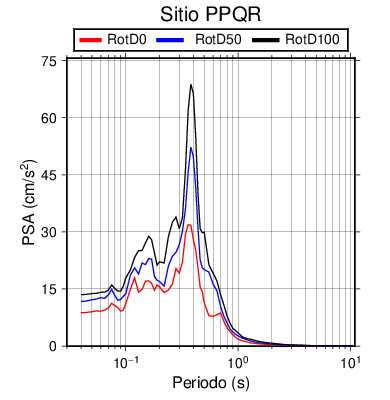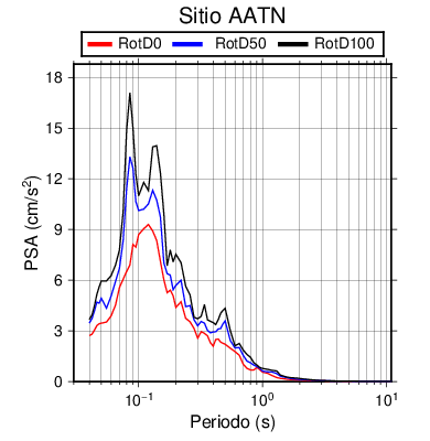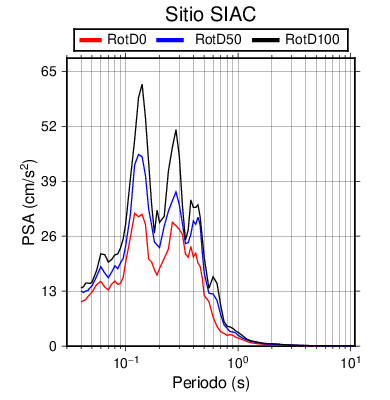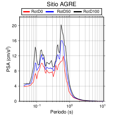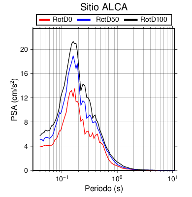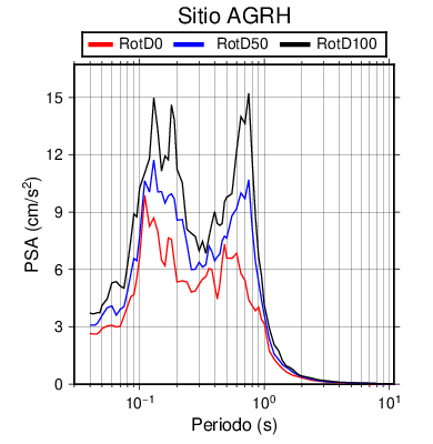 RotD50 representa un valor medio de la respuesta por lo cual se puede comparar con valores de otras medidas empleadas en modelos de atenuación como la Media Geométrica de las componentes ortogonales (GM). RotD0 y RotD100 son los valores extremos (mínimo y máximo), los cuales nos pueden servir para determinar la dispersión de la posible respuesta en cada sitio.