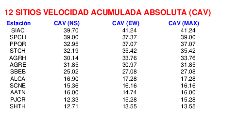 La velocidad acumulada absoluta (CAV por sus siglas en inglés) es otro parámetro que se usa para caracterizar el movimiento fuerte del suelo. Los datos están dados en cm/s para las componentes norte-sur (NS) y este-oeste (EW). El máximo de ambas se da en la tercera columna.