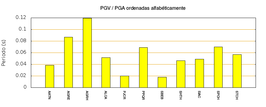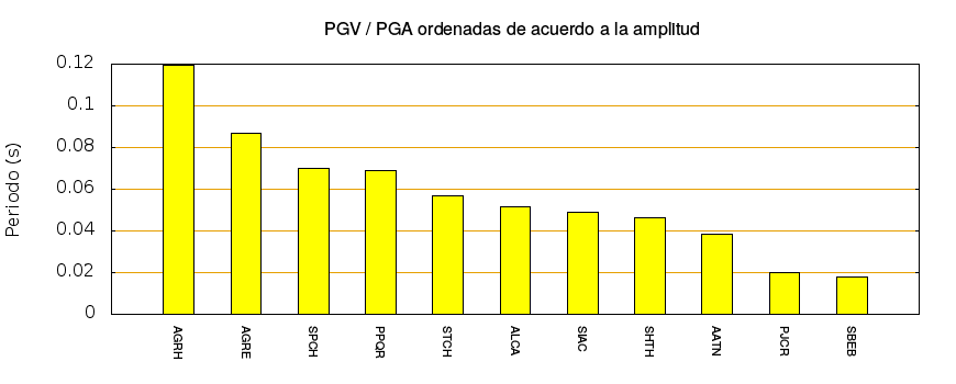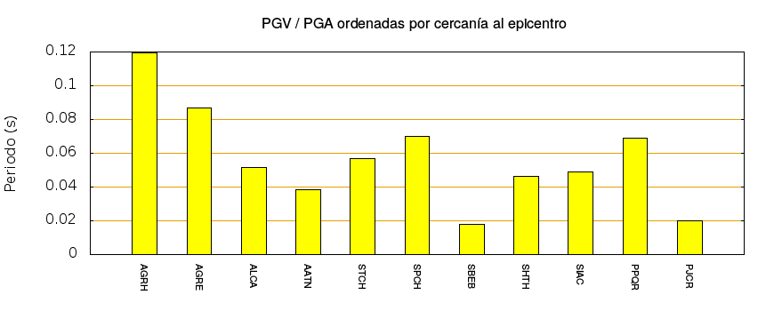 El cociente de la velocidad máxima (PGV) entre la aceleración máxima (PGA) brinda información de los periodos más significativos del movimiento del suelo. En el gráfico siguiente se muestran las estaciones ordenadas por su cercanía al epicentro. La más cercana está a la izquierda y la más lejana a la derecha. También se muestran los mismos datos en orden alfabético y ordenados de mayor a menor amplitud.