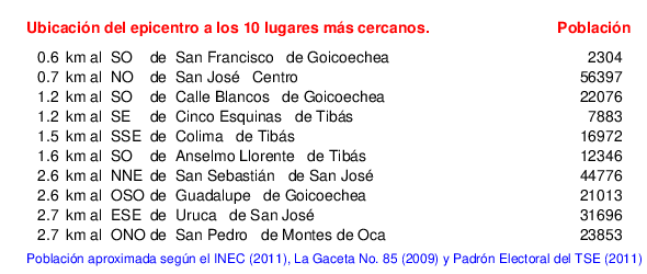 Detalle de la zona epicentral:. Se muestran los poblados más cercanos al epicentro en un radio de unos 30 km. Las principales fallas activas son las trazas de color rojo. Abajo están las distancias que hay del epicentro a cada uno de los diez sitios más cercanos y la cantidad de habitantes que poseen.