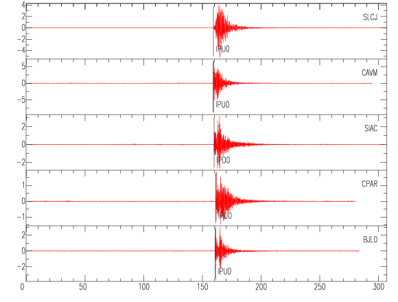Mapa del epicentro: Los triángulos verdes son las estaciones acelerográficas usadas para calcular el epicentro que se muestra como un punto amarillo. El detalle de la magnitud y distancia a San José se muestra en el cuadro inserto en el mapa.