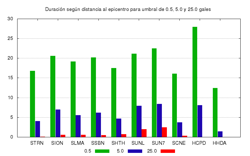 La duración para otros niveles de aceleración también se calculó. Este es el gráfico con los valores de duración para umbrales de 0.5, 5.0 y 25.0 gales. Se muestran los 10 primeros sitios ordenados por su cercanía el epicentro.