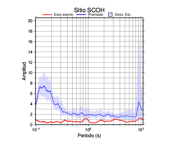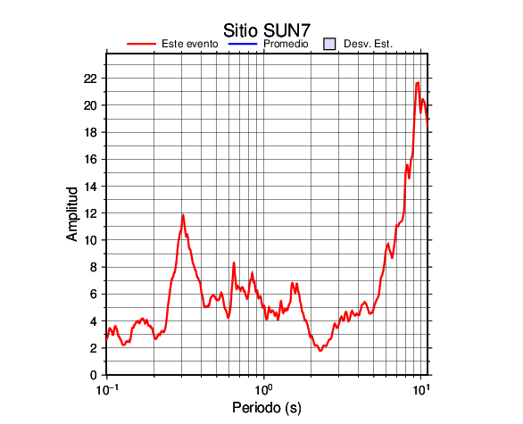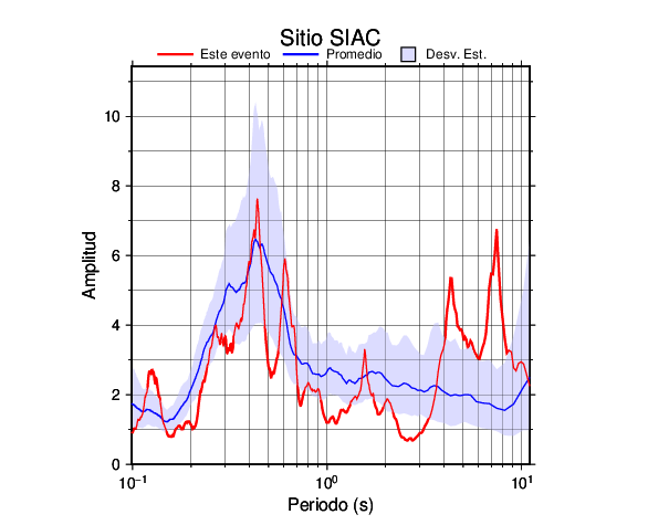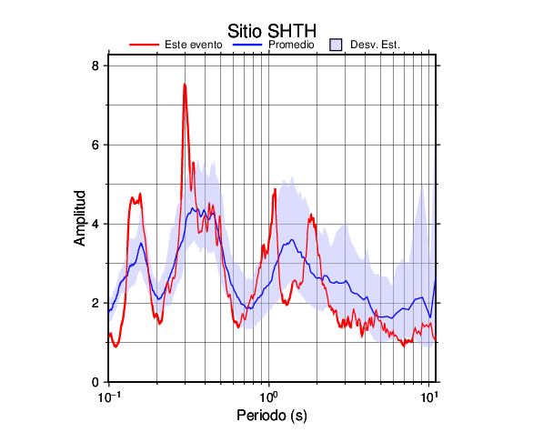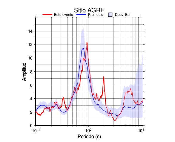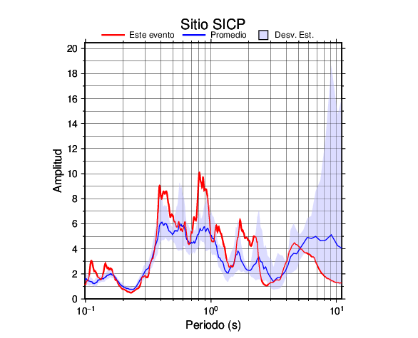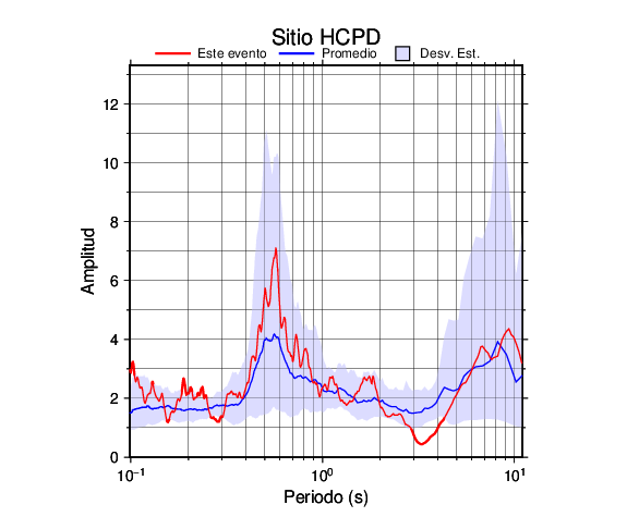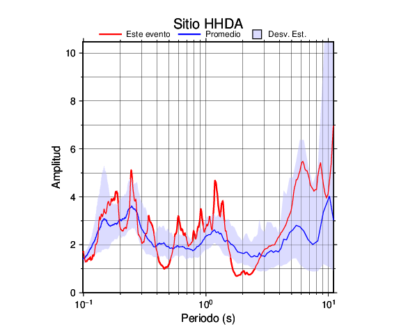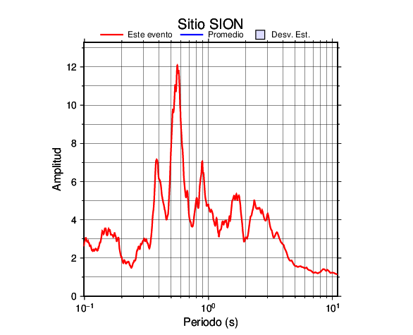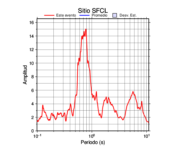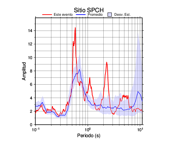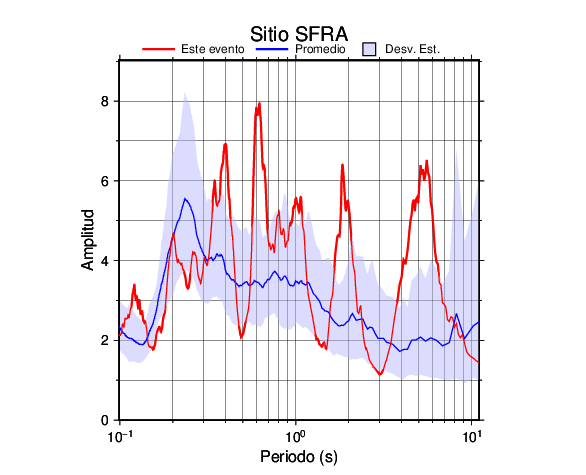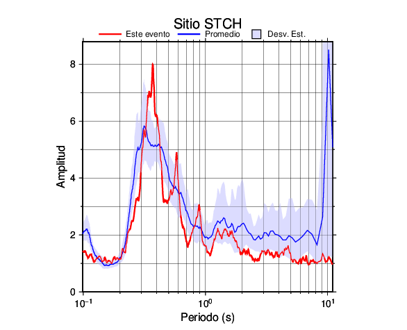 Los resultados que se presentan aquí fueron obtenidos luego de dividir las componentes horizontales entre la componente vertical (conocido como técnica H/V). Se grafica tanto el efecto de sitio del sismo registrado como el valor promedio en cada estación y su correspondiente desviación estándar.