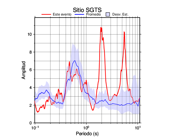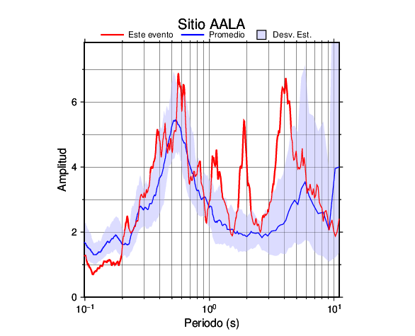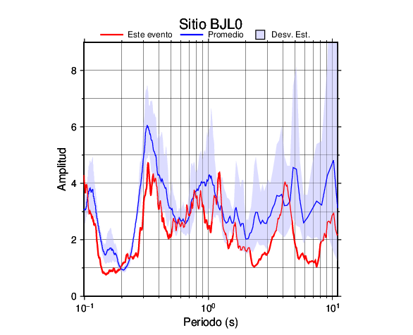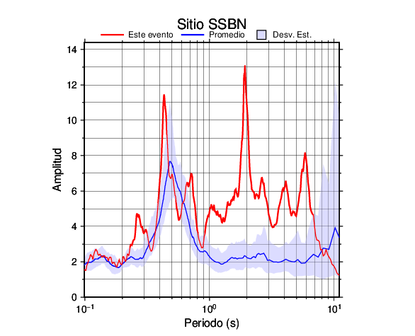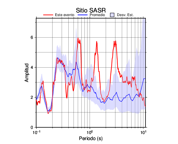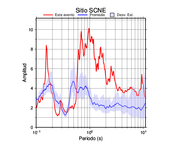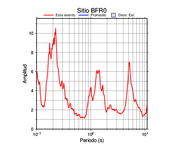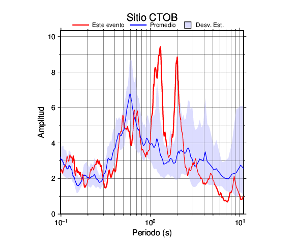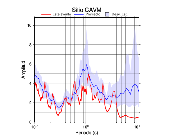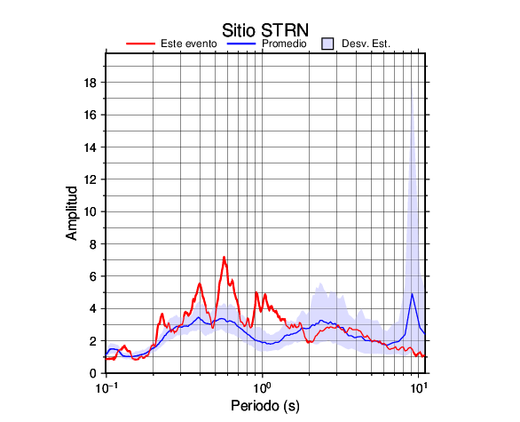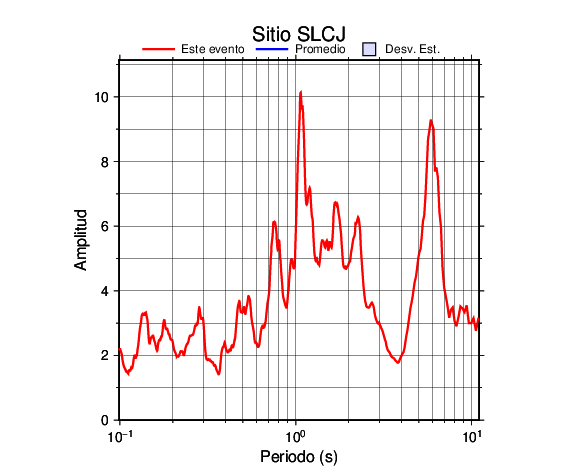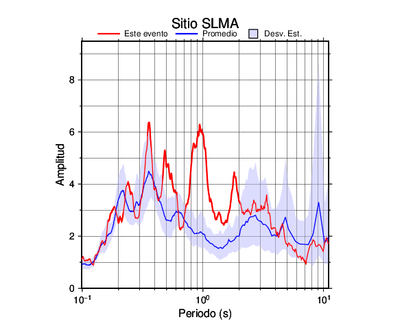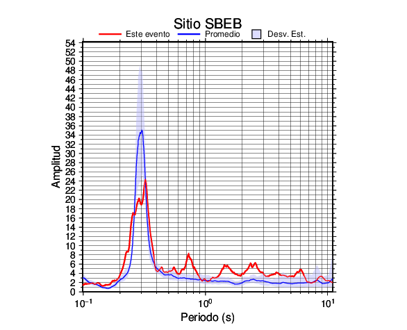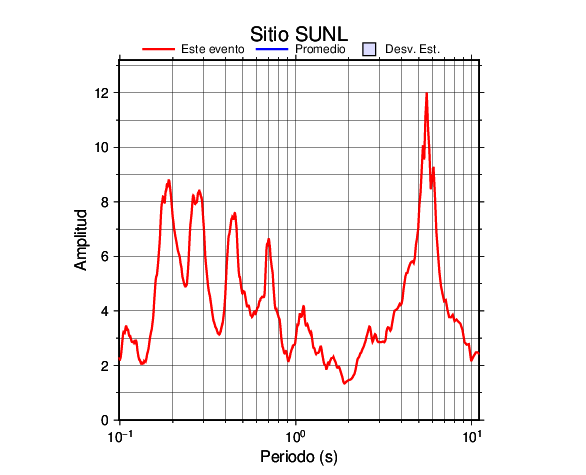 Los resultados que se presentan aquí fueron obtenidos luego de dividir las componentes horizontales entre la componente vertical (conocido como técnica H/V). Se grafica tanto el efecto de sitio del sismo registrado como el valor promedio en cada estación y su correspondiente desviación estándar.
