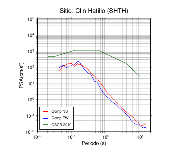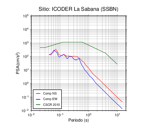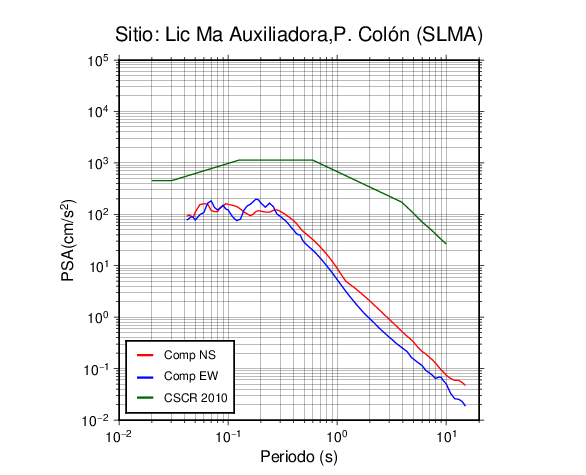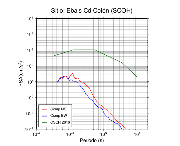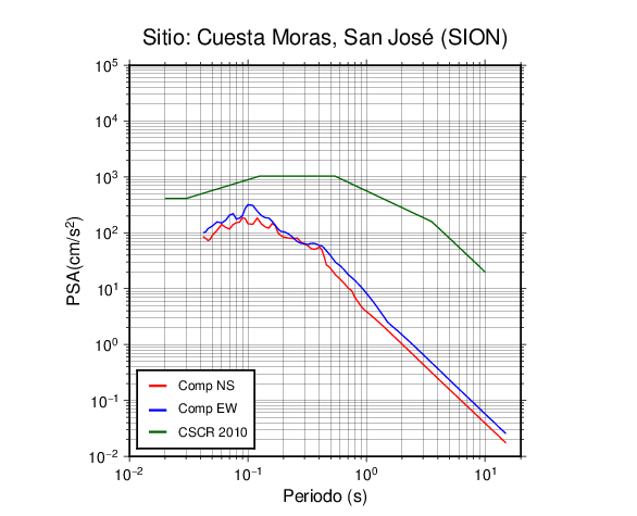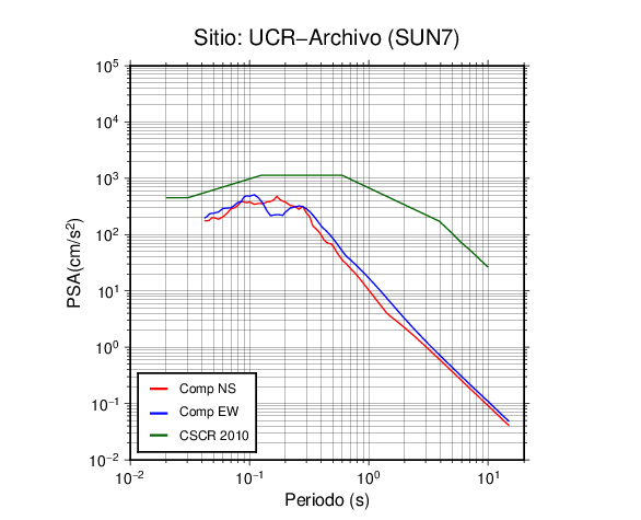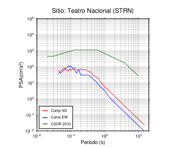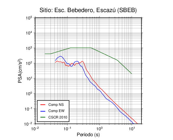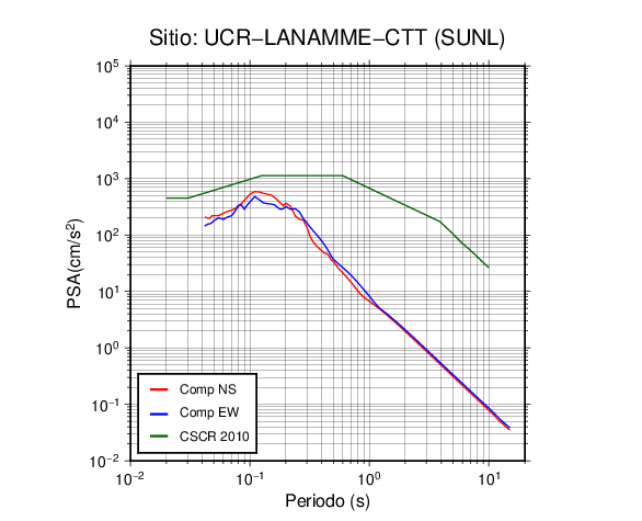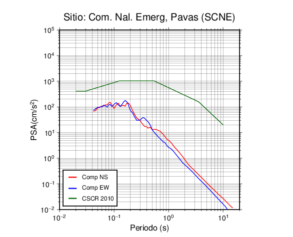 En los siguientes gráficos, la traza verde es el espectro propuesto por el CSCR-2010, la traza roja es el espectro de este sismo en la componente norte-sur (NS) y la traza azul la componente este-oeste (EW). El valor de la amplitud está dado en pseudoaceleración en cm/s2.