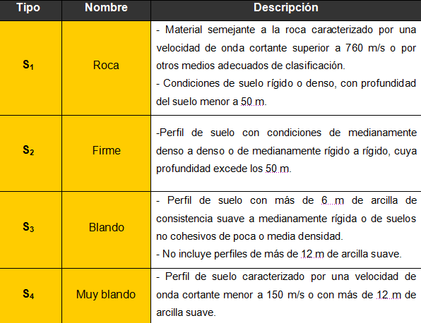 La zonificación sísmica es una guía de los valores mínimos que se deben considerar a la hora de diseñar estructuras. Además de las zonas, se debe también tomar en cuenta el tipo de suelo, sea este firme o blando. La siguiente tabla muestra la caracterización del suelo según sea rocoso (S1), firme (S2), blando (S3) o muy blando (S4). En resument, dependiendo del tipo de suelo y la zona donde se está, así será el valor de aceleración que debe ser utilizado en el diseño.